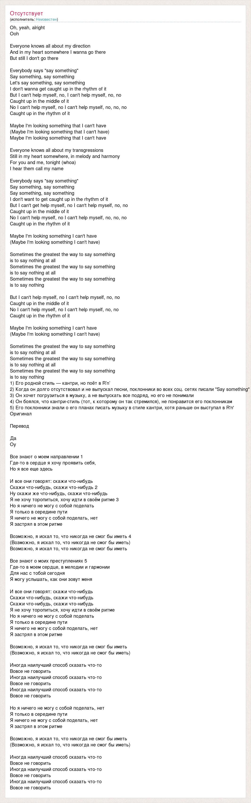 Oh, yeah, alright Ooh Everyone knows all about my direction And in my heart somewhere I wanna go there But still I don't go there Everybody says "say something" Say something, say something Let's say something, say something I don't wanna get caught up in the rhythm of it But I can't help myself, no, I can't help myself, no, no Caught up in the middle of it No I can't help myself, no I can't help myself, no, no, no Caught up in the rhythm of it Maybe I'm looking something that I can't have (Maybe I'm looking something that I can't have) Maybe I'm looking something that I can't have Everyone knows all about my transgressions Still in my heart somewhere, in melody and harmony For you and me, tonight (whoa) I hear them call my name Everybody says "say something" Say something, say something Say something, say something I don't want to get caught up in the rhythm of it But I can't get help myself, no I can't help myself, no, no Caught up in the middle of it No I can't help myself, no I can't help myself, no, no, no Caught up in the rhythm of it Maybe I'm looking something I can't have (Maybe I'm looking something I can't have) Sometimes the greatest the way to say something is to say nothing at all Sometimes the greatest the way to say something is to say nothing at all Sometimes the greatest the way to say something is to say nothing But I can't help myself, no I can't help myself, no, no Caught up in the middle of it No I can't help myself, no I can't help myself, no, no Caught up in the rhythm of it Maybe I'm looking something I can't have (Maybe I'm looking something I can't have) Sometimes the greatest the way to say something is to say nothing at all Sometimes the greatest the way to say something is to say nothing at all Sometimes the greatest the way to say something is to say nothing 1) Его родной стиль — кантри, но поёт в R’n’ 2) Когда он долго отсутствовал и не выпускал песни, поклонники во всех соц. сетях писали "Say something" 3) Он хочет погрузиться в музыку, а не выпускать все подряд, но его не понимали 4) Он боялся, что кантри-стиль (тот, к которому он так стремился), не понравится его поклонникам 5) Его поклонники знали о его планах писать музыку в стиле кантри, хотя раньше он выступал в R'n' Оригинал Перевод Да Оу Все знают о моем направлении 1 Где-то в сердце я хочу проявить себя, Но я все еще здесь И все они говорят: скажи что-нибудь Скажи что-нибудь, скажи что-нибудь 2 Ну скажи же что-нибудь, скажи что-нибудь Я не хочу торопиться, хочу идти в своём ритме 3 Но я ничего не могу с собой поделать Я только в середине пути Я ничего не могу с собой поделать, нет Я застрял в этом ритме Возможно, я искал то, что никогда не смог бы иметь 4 (Возможно, я искал то, что никогда не смог бы иметь) Возможно, я искал то, что никогда не смог бы иметь Все знают о моих преступлениях 5 Где-то в моем сердце, в мелодии и гармонии Для нас с тобой сегодня Я могу услышать, как они зовут меня И все они говорят: скажи что-нибудь Скажи что-нибудь, скажи что-нибудь Скажи что-нибудь, скажи что-нибудь Я не хочу торопиться, хочу идти в своём ритме Но я ничего не могу с собой поделать Я только в середине пути Я ничего не могу с собой поделать, нет Я застрял в этом ритме Возможно, я искал то, что никогда не смог бы иметь (Возможно, я искал то, что никогда не смог бы иметь) Иногда наилучший способ сказать что-то Вовсе не говорить Иногда наилучший способ сказать что-то Вовсе не говорить Иногда наилучший способ сказать что-то Вовсе не говорить Но я ничего не могу с собой поделать, нет Я только в середине пути Я ничего не могу с собой поделать, нет Я застрял в этом ритме Возможно, я искал то, что никогда не смог бы иметь (Возможно, я искал то, что никогда не смог бы иметь) Иногда наилучший способ сказать что-то Вовсе не говорить Иногда наилучший способ сказать что-то Вовсе не говорить Иногда наилучший способ сказать что-то Вовсе не говорить