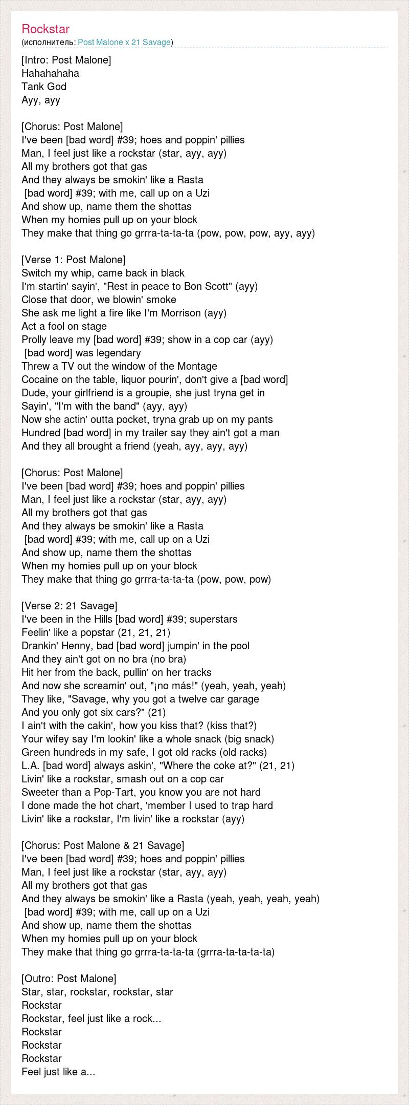 [Intro: Post Malone] Hahahahaha Tank God Ayy, ayy [Chorus: Post Malone] I've been [bad word] #39; hoes and poppin' pillies Man, I feel just like a rockstar (star, ayy, ayy) All my brothers got that gas And they always be smokin' like a Rasta [bad word] #39; with me, call up on a Uzi And show up, name them the shottas When my homies pull up on your block They make that thing go grrra-ta-ta-ta (pow, pow, pow, ayy, ayy) [Verse 1: Post Malone] Switch my whip, came back in black I'm startin' sayin', "Rest in peace to Bon Scott" (ayy) Close that door, we blowin' smoke She ask me light a fire like I'm Morrison (ayy) Act a fool on stage Prolly leave my [bad word] #39; show in a cop car (ayy) [bad word] was legendary Threw a TV out the window of the Montage Cocaine on the table, liquor pourin', don't give a [bad word] Dude, your girlfriend is a groupie, she just tryna get in Sayin', "I'm with the band" (ayy, ayy) Now she actin' outta pocket, tryna grab up on my pants Hundred [bad word] in my trailer say they ain't got a man And they all brought a friend (yeah, ayy, ayy, ayy) [Chorus: Post Malone] I've been [bad word] #39; hoes and poppin' pillies Man, I feel just like a rockstar (star, ayy, ayy) All my brothers got that gas And they always be smokin' like a Rasta [bad word] #39; with me, call up on a Uzi And show up, name them the shottas When my homies pull up on your block They make that thing go grrra-ta-ta-ta (pow, pow, pow) [Verse 2: 21 Savage] I've been in the Hills [bad word] #39; superstars Feelin' like a popstar (21, 21, 21) Drankin' Henny, bad [bad word] jumpin' in the pool And they ain't got on no bra (no bra) Hit her from the back, pullin' on her tracks And now she screamin' out, "¡no más!" (yeah, yeah, yeah) They like, "Savage, why you got a twelve car garage And you only got six cars?" (21) I ain't with the cakin', how you kiss that? (kiss that?) Your wifey say I'm lookin' like a whole snack (big snack) Green hundreds in my safe, I got old racks (old racks) L.A. [bad word] always askin', "Where the coke at?" (21, 21) Livin' like a rockstar, smash out on a cop car Sweeter than a Pop-Tart, you know you are not hard I done made the hot chart, 'member I used to trap hard Livin' like a rockstar, I'm livin' like a rockstar (ayy) [Chorus: Post Malone & 21 Savage] I've been [bad word] #39; hoes and poppin' pillies Man, I feel just like a rockstar (star, ayy, ayy) All my brothers got that gas And they always be smokin' like a Rasta (yeah, yeah, yeah, yeah) [bad word] #39; with me, call up on a Uzi And show up, name them the shottas When my homies pull up on your block They make that thing go grrra-ta-ta-ta (grrra-ta-ta-ta-ta) [Outro: Post Malone] Star, star, rockstar, rockstar, star Rockstar Rockstar, feel just like a rock... Rockstar Rockstar Rockstar Feel just like a...