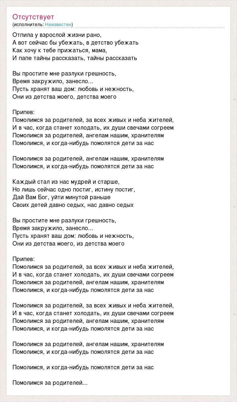 Отпила у взрослой жизни рано, А вот сейчас бы убежать, в детство убежать Как хочу к тебе прижаться, мама, И папе тайны рассказать, тайны рассказать Вы простите мне разлуки грешность, Время закружило, занесло... Пусть хранят ваш дом: любовь и нежность, Они из детства моего, детства моего Припев: Помолимся за родителей, за всех живых и неба жителей, И в час, когда станет холодать, их души свечами согреем Помолимся за родителей, ангелам нашим, хранителям Помолимся, и когда-нибудь помолятся дети за нас Помолимся за родителей, ангелам нашим, хранителям Помолимся, и когда-нибудь помолятся дети за нас Каждый стал из нас мудрей и старше, Но лишь сейчас одно постиг, истину постиг, Дай Вам Бог, уйти минутой раньше Своих детей давно седых, нас давно седых Вы простите мне разлуки грешность, Время закружило, занесло... Пусть хранят ваш дом: любовь и нежность, Они из детства моего, из детства моего Припев: Помолимся за родителей, за всех живых и неба жителей, И в час, когда станет холодать, их души свечами согреем Помолимся за родителей, ангелам нашим, хранителям Помолимся, и когда-нибудь помолятся дети за нас Помолимся за родителей, за всех живых и неба жителей, И в час, когда станет холодать, их души свечами согреем Помолимся за родителей, ангелам нашим, хранителям Помолимся, и когда-нибудь помолятся дети за нас Помолимся за родителей, ангелам нашим, хранителям Помолимся, и когда-нибудь помолятся дети за нас Помолимся, и когда-нибудь помолятся дети за нас Помолимся за родителей...