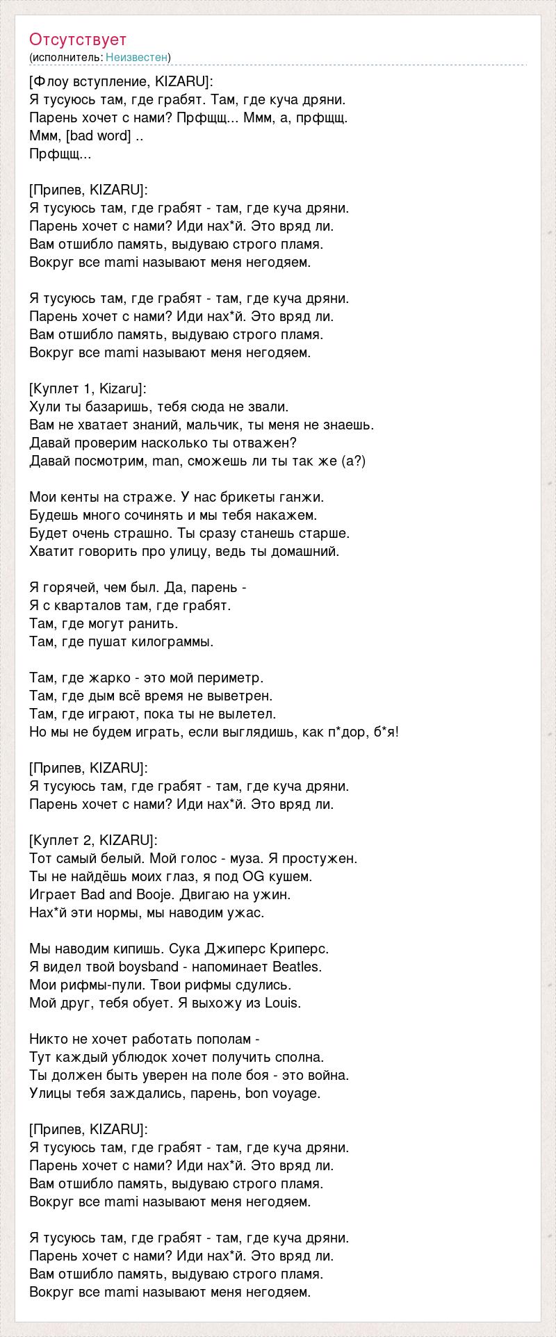 [Флоу вступление, KIZARU]: Я тусуюсь там, где грабят. Там, где куча дряни. Парень хочет с нами? Прфщщ... Ммм, а, прфщщ. Ммм, [bad word] .. Прфщщ... [Припев, KIZARU]: Я тусуюсь там, где грабят - там, где куча дряни. Парень хочет с нами? Иди нах*й. Это вряд ли. Вам отшибло память, выдуваю строго пламя. Вокруг все mami называют меня негодяем. Я тусуюсь там, где грабят - там, где куча дряни. Парень хочет с нами? Иди нах*й. Это вряд ли. Вам отшибло память, выдуваю строго пламя. Вокруг все mami называют меня негодяем. [Куплет 1, Kizaru]: Хули ты базаришь, тебя сюда не звали. Вам не хватает знаний, мальчик, ты меня не знаешь. Давай проверим насколько ты отважен? Давай посмотрим, man, сможешь ли ты так же (а?) Мои кенты на страже. У нас брикеты ганжи. Будешь много сочинять и мы тебя накажем. Будет очень страшно. Ты сразу станешь старше. Хватит говорить про улицу, ведь ты домашний. Я горячей, чем был. Да, парень - Я с кварталов там, где грабят. Там, где могут ранить. Там, где пушат килограммы. Там, где жарко - это мой периметр. Там, где дым всё время не выветрен. Там, где играют, пока ты не вылетел. Но мы не будем играть, если выглядишь, как п*дор, б*я! [Припев, KIZARU]: Я тусуюсь там, где грабят - там, где куча дряни. Парень хочет с нами? Иди нах*й. Это вряд ли. [Куплет 2, KIZARU]: Тот самый белый. Мой голос - муза. Я простужен. Ты не найдёшь моих глаз, я под OG кушем. Играет Bad and Booje. Двигаю на ужин. Нах*й эти нормы, мы наводим ужас. Мы наводим кипишь. Сука Джиперс Криперс. Я видел твой boysband - напоминает Beatles. Мои рифмы-пули. Твои рифмы сдулись. Мой друг, тебя обует. Я выхожу из Louis. Никто не хочет работать пополам - Тут каждый ублюдок хочет получить сполна. Ты должен быть уверен на поле боя - это война. Улицы тебя заждались, парень, bon voyage. [Припев, KIZARU]: Я тусуюсь там, где грабят - там, где куча дряни. Парень хочет с нами? Иди нах*й. Это вряд ли. Вам отшибло память, выдуваю строго пламя. Вокруг все mami называют меня негодяем. Я тусуюсь там, где грабят - там, где куча дряни. Парень хочет с нами? Иди нах*й. Это вряд ли. Вам отшибло память, выдуваю строго пламя. Вокруг все mami называют меня негодяем.