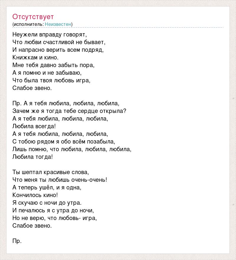 Неужели вправду говорят, Что любви счастливой не бывает, И напрасно верить всем подряд, Книжкам и кино. Мне тебя давно забыть пора, А я помню и не забываю, Что была твоя любовь игра, Слабое звено. Пр. А я тебя любила, любила, любила, Зачем же я тогда тебе сердце открыла? А я тебя любила, любила, любила, Любила всегда! А я тебя любила, любила, любила, С тобою рядом я обо всём позабыла, Лишь помню, что любила, любила, любила, Любила тогда! Ты шептал красивые слова, Что меня ты любишь очень-очень! А теперь ушёл, и я одна, Кончилось кино! Я скучаю с ночи до утра. И печалюсь я с утра до ночи, Но не верю, что любовь- игра, Слабое звено. Пр.