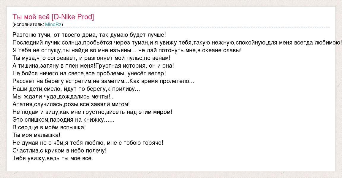 Разгоню тучи, от твоего дома, так думаю будет лучше! Последний лучик солнца,пробьётся через туман,и я увижу тебя,такую нежную,спокойную,для меня всегда любимою! Я тебя не отпущу,ты найди во мне изъяны... не дай потонуть мне,в океане славы! Ты муза,что согревает, и разгоняет мой пульс,по венам! А тишина,затяну в плен меня!Грустная история, он и она! Не бойся ничего на свете,все проблемы, унесёт ветер! Рассвет на берегу встретим,не заметим...Как время пролетело... Наши дети,смело, идут по берегу,к приливу... Мы ждали чуда,дождались мечты!.. Апатия,случилась,розы все завяли мигом! Не подам и виду,как мне грустно,висеть над этим миром! Это слишком,пародия на книжку...... В сердце в моём вспышка! Ты моя малышка! Не думай не о чём,я тебя люблю, мне с тобою горячо! Счастлив,с криком в небо полечу! Тебя увижу,ведь ты моё всё.