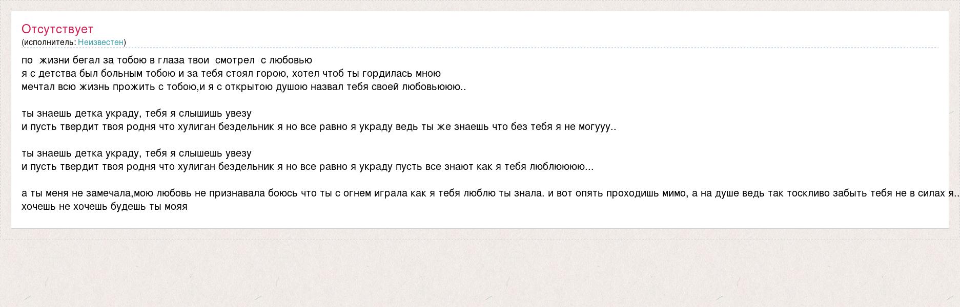 по жизни бегал за тобою в глаза твои смотрел с любовью я с детства был больным тобою и за тебя стоял горою, хотел чтоб ты гордилась мною мечтал всю жизнь прожить с тобою,и я с открытою душою назвал тебя своей любовьююю.. ты знаешь детка украду, тебя я слышишь увезу и пусть твердит твоя родня что хулиган бездельник я но все равно я украду ведь ты же знаешь что без тебя я не могууу.. ты знаешь детка украду, тебя я слышешь увезу и пусть твердит твоя родня что хулиган бездельник я но все равно я украду пусть все знают как я тебя люблюююю... а ты меня не замечала,мою любовь не признавала боюсь что ты с огнем играла как я тебя люблю ты знала. и вот опять проходишь мимо, а на душе ведь так тоскливо забыть тебя не в силах я.. хочешь не хочешь будешь ты мояя