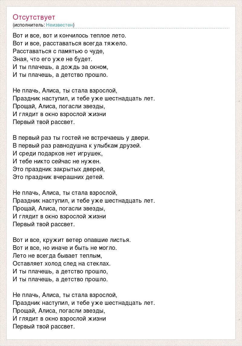 Вот и все, вот и кончилось теплое лето. Вот и все, расставаться всегда тяжело. Расставаться с памятью о чуде, Зная, что его уже не будет. И ты плачешь, а дождь за окном, И ты плачешь, а детство прошло. Не плачь, Алиса, ты стала взрослой, Праздник наступил, и тебе уже шестнадцать лет. Прощай, Алиса, погасли звезды, И глядит в окно взрослой жизни Первый твой рассвет. В первый раз ты гостей не встречаешь у двери. В первый раз равнодушна к улыбкам друзей. И среди подарков нет игрушек, И тебе никто сейчас не нужен. Это праздник закрытых дверей, Это праздник вчерашних детей. Не плачь, Алиса, ты стала взрослой, Праздник наступил, и тебе уже шестнадцать лет. Прощай, Алиса, погасли звезды, И глядит в окно взрослой жизни Первый твой рассвет. Вот и все, кружит ветер опавшие листья. Вот и все, но иначе и быть не могло. Лето не всегда бывает теплым, Оставляет холод след на стеклах. И ты плачешь, а детство прошло, И ты плачешь, а детство прошло. Не плачь, Алиса, ты стала взрослой, Праздник наступил, и тебе уже шестнадцать лет. Прощай, Алиса, погасли звезды, И глядит в окно взрослой жизни Первый твой рассвет.
