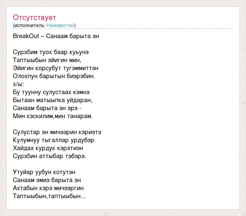 BreakOut – Санаам барыта эн Сурэ5им туох баар куьунэ Таптыыбын эйигин мин, Эйигин корсубут тугэммиттэн Олохпун барытын биэрэбин. х/ы: Бу туунну сулустаах кэмнэ Бытаан матыыпка уйдаран, Санаам барыта эн эрэ - Мин кэскилим,мин танарам. Сулустар эн мичээрин кэриэтэ Кулумнуу тыгаллар урдубэр Хайдах курдук кэрэтиэн Сурэ5ин аттыбар тэбэрэ. Утуйар уубун котутэн Санаам эмиэ барыта эн Ахтабын кэрэ мичээргин Таптыыбын,таптыыбын...