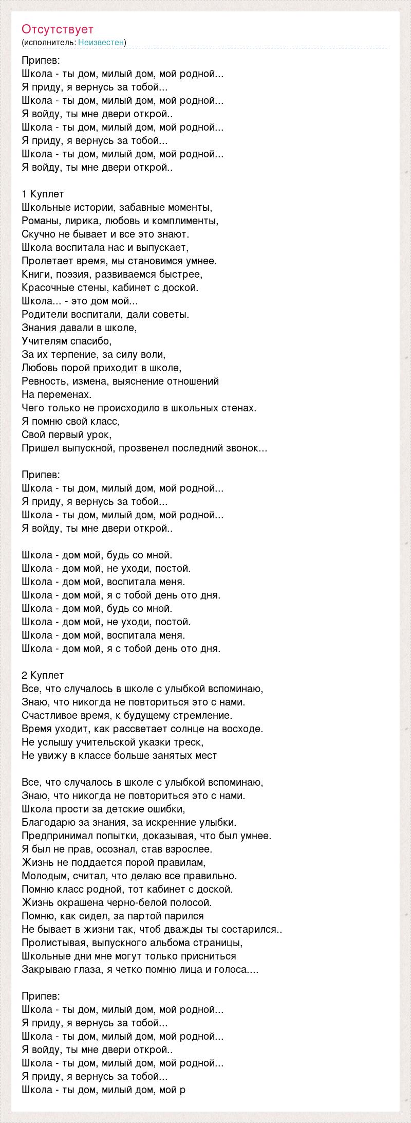 Припев: Школа - ты дом, милый дом, мой родной... Я приду, я вернусь за тобой... Школа - ты дом, милый дом, мой родной... Я войду, ты мне двери открой.. Школа - ты дом, милый дом, мой родной... Я приду, я вернусь за тобой... Школа - ты дом, милый дом, мой родной... Я войду, ты мне двери открой.. 1 Куплет Школьные истории, забавные моменты, Романы, лирика, любовь и комплименты, Скучно не бывает и все это знают. Школа воспитала нас и выпускает, Пролетает время, мы становимся умнее. Книги, поэзия, развиваемся быстрее, Красочные стены, кабинет с доской. Школа... - это дом мой... Родители воспитали, дали советы. Знания давали в школе, Учителям спасибо, За их терпение, за силу воли, Любовь порой приходит в школе, Ревность, измена, выяснение отношений На переменах. Чего только не происходило в школьных стенах. Я помню свой класс, Свой первый урок, Пришел выпускной, прозвенел последний звонок... Припев: Школа - ты дом, милый дом, мой родной... Я приду, я вернусь за тобой... Школа - ты дом, милый дом, мой родной... Я войду, ты мне двери открой.. Школа - дом мой, будь со мной. Школа - дом мой, не уходи, постой. Школа - дом мой, воспитала меня. Школа - дом мой, я с тобой день ото дня. Школа - дом мой, будь со мной. Школа - дом мой, не уходи, постой. Школа - дом мой, воспитала меня. Школа - дом мой, я с тобой день ото дня. 2 Куплет Все, что случалось в школе с улыбкой вспоминаю, Знаю, что никогда не повториться это с нами. Счастливое время, к будущему стремление. Время уходит, как рассветает солнце на восходе. Не услышу учительской указки треск, Не увижу в классе больше занятых мест Все, что случалось в школе с улыбкой вспоминаю, Знаю, что никогда не повториться это с нами. Школа прости за детские ошибки, Благодарю за знания, за искренние улыбки. Предпринимал попытки, доказывая, что был умнее. Я был не прав, осознал, став взрослее. Жизнь не поддается порой правилам, Молодым, считал, что делаю все правильно. Помню класс родной, тот кабинет с доской. Жизнь окрашена черно-белой полосой. Помню, как сидел, за партой парился Не бывает в жизни так, чтоб дважды ты состарился.. Пролистывая, выпускного альбома страницы, Школьные дни мне могут только присниться Закрываю глаза, я четко помню лица и голоса.... Припев: Школа - ты дом, милый дом, мой родной... Я приду, я вернусь за тобой... Школа - ты дом, милый дом, мой родной... Я войду, ты мне двери открой.. Школа - ты дом, милый дом, мой родной... Я приду, я вернусь за тобой... Школа - ты дом, милый дом, мой р