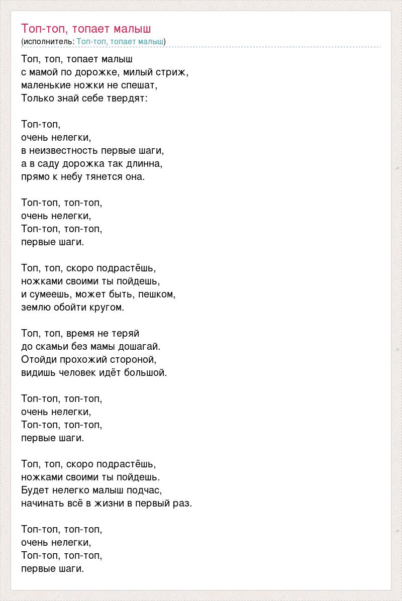 Топ, топ, топает малыш с мамой по дорожке, милый стриж, маленькие ножки не спешат, Только знай себе твердят: Топ-топ, очень нелегки, в неизвестность первые шаги, а в саду дорожка так длинна, прямо к небу тянется она. Топ-топ, топ-топ, очень нелегки, Топ-топ, топ-топ, первые шаги. Топ, топ, скоро подрастёшь, ножками своими ты пойдешь, и сумеешь, может быть, пешком, землю обойти кругом. Топ, топ, время не теряй до скамьи без мамы дошагай. Отойди прохожий стороной, видишь человек идёт большой. Топ-топ, топ-топ, очень нелегки, Топ-топ, топ-топ, первые шаги. Топ, топ, скоро подрастёшь, ножками своими ты пойдешь. Будет нелегко малыш подчас, начинать всё в жизни в первый раз. Топ-топ, топ-топ, очень нелегки, Топ-топ, топ-топ, первые шаги.