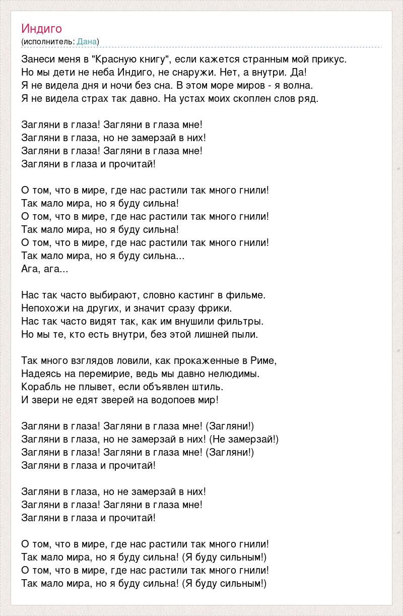 Занеси меня в "Красную книгу", если кажется странным мой прикус. Но мы дети не неба Индиго, не снаружи. Нет, а внутри. Да! Я не видела дня и ночи без сна. В этом море миров - я волна. Я не видела страх так давно. На устах моих скоплен слов ряд. Загляни в глаза! Загляни в глаза мне! Загляни в глаза, но не замерзай в них! Загляни в глаза! Загляни в глаза мне! Загляни в глаза и прочитай! О том, что в мире, где нас растили так много гнили! Так мало мира, но я буду сильна! О том, что в мире, где нас растили так много гнили! Так мало мира, но я буду сильна! О том, что в мире, где нас растили так много гнили! Так мало мира, но я буду сильна... Ага, ага... Нас так часто выбирают, словно кастинг в фильме. Непохожи на других, и значит сразу фрики. Нас так часто видят так, как им внушили фильтры. Но мы те, кто есть внутри, без этой лишней пыли. Так много взглядов ловили, как прокаженные в Риме, Надеясь на перемирие, ведь мы давно нелюдимы. Корабль не плывет, если объявлен штиль. И звери не едят зверей на водопоев мир! Загляни в глаза! Загляни в глаза мне! (Загляни!) Загляни в глаза, но не замерзай в них! (Не замерзай!) Загляни в глаза! Загляни в глаза мне! (Загляни!) Загляни в глаза и прочитай! Загляни в глаза, но не замерзай в них! Загляни в глаза! Загляни в глаза мне! Загляни в глаза и прочитай! О том, что в мире, где нас растили так много гнили! Так мало мира, но я буду сильна! (Я буду сильным!) О том, что в мире, где нас растили так много гнили! Так мало мира, но я буду сильна! (Я буду сильным!)