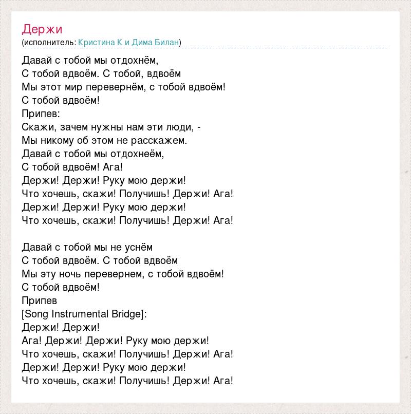 Давай с тобой мы отдохнём, С тобой вдвоём. С тобой, вдвоём Мы этот мир перевернём, с тобой вдвоём! С тобой вдвоём! Припев: Скажи, зачем нужны нам эти люди, - Мы никому об этом не расскажем. Давай с тобой мы отдохнеём, С тобой вдвоём! Ага! Держи! Держи! Руку мою держи! Что хочешь, скажи! Получишь! Держи! Ага! Держи! Держи! Руку мою держи! Что хочешь, скажи! Получишь! Держи! Ага! Давай с тобой мы не уснём С тобой вдвоём. С тобой вдвоём Мы эту ночь перевернем, с тобой вдвоём! С тобой вдвоём! Припев [Song Instrumental Bridge]: Держи! Держи! Ага! Держи! Держи! Руку мою держи! Что хочешь, скажи! Получишь! Держи! Ага! Держи! Держи! Руку мою держи! Что хочешь, скажи! Получишь! Держи! Ага!