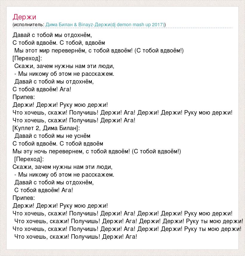 Давай с тобой мы отдохнём, С тобой вдвоём. С тобой, вдвоём Мы этот мир перевернём, с тобой вдвоём! (С тобой вдвоём!) [Переход]: Скажи, зачем нужны нам эти люди, - Мы никому об этом не расскажем. Давай с тобой мы отдохнём, С тобой вдвоём! Ага! Припев: Держи! Держи! Руку мою держи! Что хочешь, скажи! Получишь! Держи! Ага! Держи! Держи! Руку мою держи! Что хочешь, скажи! Получишь! Держи! Ага! [Куплет 2, Дима Билан]: Давай с тобой мы не уснём С тобой вдвоём. С тобой вдвоём Мы эту ночь перевернем, с тобой вдвоём! (С тобой вдвоём!) [Переход]: Скажи, зачем нужны нам эти люди, - Мы никому об этом не расскажем. Давай с тобой мы отдохнём, С тобой вдвоём! Ага! Припев: Держи! Держи! Руку мою держи! Что хочешь, скажи! Получишь! Держи! Ага! Держи! Держи! Руку мою держи! Что хочешь, скажи! Получишь! Держи! Ага! Держи! Держи! Руку ты мою держи! Что хочешь, скажи! Получишь! Держи! Ага! Держи! Держи! Руку ты мою держи! Что хочешь, скажи! Получишь! Держи! Ага!