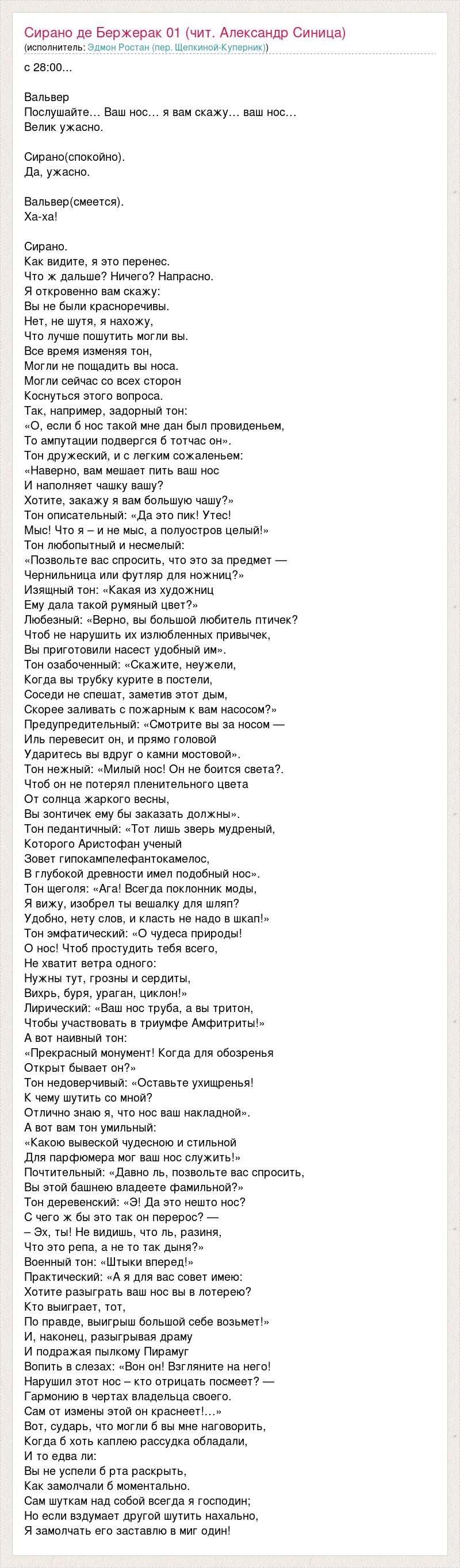 с 28:00... Вальвер Послушайте… Ваш нос… я вам скажу… ваш нос… Велик ужасно. Сирано(спокойно). Да, ужасно. Вальвер(смеется). Ха-ха! Сирано. Как видите, я это перенес. Что ж дальше? Ничего? Напрасно. Я откровенно вам скажу: Вы не были красноречивы. Нет, не шутя, я нахожу, Что лучше пошутить могли вы. Все время изменяя тон, Могли не пощадить вы носа. Могли сейчас со всех сторон Коснуться этого вопроса. Так, например, задорный тон: «О, если б нос такой мне дан был провиденьем, То ампутации подвергся б тотчас он». Тон дружеский, и с легким сожаленьем: «Наверно, вам мешает пить ваш нос И наполняет чашку вашу? Хотите, закажу я вам большую чашу?» Тон описательный: «Да это пик! Утес! Мыс! Что я – и не мыс, а полуостров целый!» Тон любопытный и несмелый: «Позвольте вас спросить, что это за предмет — Чернильница или футляр для ножниц?» Изящный тон: «Какая из художниц Ему дала такой румяный цвет?» Любезный: «Верно, вы большой любитель птичек? Чтоб не нарушить их излюбленных привычек, Вы приготовили насест удобный им». Тон озабоченный: «Скажите, неужели, Когда вы трубку курите в постели, Соседи не спешат, заметив этот дым, Скорее заливать с пожарным к вам насосом?» Предупредительный: «Смотрите вы за носом — Иль перевесит он, и прямо головой Ударитесь вы вдруг о камни мостовой». Тон нежный: «Милый нос! Он не боится света?. Чтоб он не потерял пленительного цвета От солнца жаркого весны, Вы зонтичек ему бы заказать должны». Тон педантичный: «Тот лишь зверь мудреный, Которого Аристофан ученый Зовет гипокампелефантокамелос, В глубокой древности имел подобный нос». Тон щеголя: «Ага! Всегда поклонник моды, Я вижу, изобрел ты вешалку для шляп? Удобно, нету слов, и класть не надо в шкап!» Тон эмфатический: «О чудеса природы! О нос! Чтоб простудить тебя всего, Не хватит ветра одного: Нужны тут, грозны и сердиты, Вихрь, буря, ураган, циклон!» Лирический: «Ваш нос труба, а вы тритон, Чтобы участвовать в триумфе Амфитриты!» А вот наивный тон: «Прекрасный монумент! Когда для обозренья Открыт бывает он?» Тон недоверчивый: «Оставьте ухищренья! К чему шутить со мной? Отлично знаю я, что нос ваш накладной». А вот вам тон умильный: «Какою вывеской чудесною и стильной Для парфюмера мог ваш нос служить!» Почтительный: «Давно ль, позвольте вас спросить, Вы этой башнею владеете фамильной?» Тон деревенский: «Э! Да это нешто нос? С чего ж бы это так он перерос? — – Эх, ты! Не видишь, что ль, разиня, Что это репа, а не то так дыня?» Военный тон: «Штыки вперед!» Практический: «А я для вас совет имею: Хотите разыграть ваш нос вы в лотерею? Кто выиграет, тот, По правде, выигрыш большой себе возьмет!» И, наконец, разыгрывая драму И подражая пылкому Пирамуг Вопить в слезах: «Вон он! Взгляните на него! Нарушил этот нос – кто отрицать посмеет? — Гармонию в чертах владельца своего. Сам от измены этой он краснеет!…» Вот, сударь, что могли б вы мне наговорить, Когда б хоть каплею рассудка обладали, И то едва ли: Вы не успели б рта раскрыть, Как замолчали б моментально. Сам шуткам над собой всегда я господин; Но если вздумает другой шутить нахально, Я замолчать его заставлю в миг один!