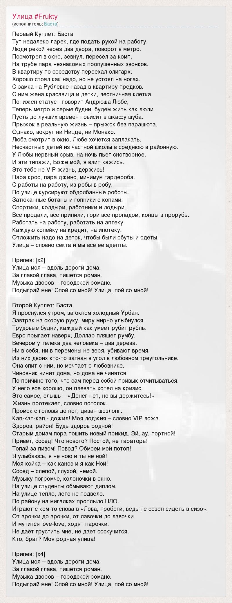 Первый Куплет: Баста Тут недалеко ларек, где подать рукой на работу. Люди рекой через два двора, поворот в метро. Посмотрел в окно, зевнул, пересел за комп. На трубе пара незнакомых пропущенных звонков. В квартиру по соседству переехал олигарх. Хорошо стоял как надо, но не устоял на ногах. С замка на Рублевке назад в квартиру предков. С ним жена красавица и детки, лестничная клетка. Понижен статус - говорит Андрюша Любе, Теперь метро и серые будни, будем жить как люди. Пусть до лучших времен повисит в шкафу шуба. Прыжок в реальную жизнь – прыжок без парашюта. Однако, вокруг ни Ницце, ни Монако. Люба смотрит в окно, Любе хочется заплакать. Несчастных детей из частной школы в среднюю в районную. У Любы нервный срыв, на ночь пьет снотворное. И эти типажи, Боже мой, я влип кажись. Это тебе не VIP жизнь, держись! Пара крос, пара джинс, минимум гардероба. С работы на работу, из робы в робу. По улице курсируют обдолбанные роботы. Затюканные ботаны и гопники с копами. Спортики, колдыри, работники и лодыри. Все продали, все припили, гори все пропадом, концы в прорубь. Работать на работу, работать на аптеку. Каждую копейку на кредит, на ипотеку. Отложить надо на деток, чтобы были обуты и одеты. Улица – словно секта и мы все ее адепты. Припев: [x2] Улица моя – вдоль дороги дома. За главой глава, пишется роман. Музыка дворов – городской романс. Подыграй мне! Спой со мной! Улица, пой со мной! Второй Куплет: Баста Я проснулся утром, за окном холодный Урбан. Завтрак на скорую руку, миру мирно улыбнулся. Трудовые будни, каждый как умеет рубит рубль. Евро прыгает наверх, Доллар пляшет румбу. Вечером у телека два человека – два дерева. Ни в себя, ни в перемены не веря, убивают время. Из них двоих кто-то загнан в угол в любовном треугольнике. Она спит с ним, но мечтает о любовнике. Чиновник чинит дома, но дома не чинятся По причине того, что сам перед собой привык отчитываться. У него все хорошо, он плевать хотел на кризис. Это самое, слышь – «Денег нет, но вы держитесь!» Жизнь протекает, словно потолок. Промок с головы до ног, диван шезлонг. Кап-кап-кап - дожил! Моя лоджия – словно VIP ложа. Здоров, район! Будь здоров родной! Старым домам пора пошить новый прикид. Эй, ау, портной! Привет, сосед! Что нового? Постой, не тараторь! Топай за пивом! Повод? Обмоем мой потоп! Я улыбаюсь, я не ною и ты не ной! Моя койка – как каноэ и я как Ной! Сосед – слепой, глухой, немой. Музыку погромче, колоночки в окно. На улице студенты обмывают диплом. На улице тепло, лето не подвело. По району на мигалках проплыло НЛО. Играют с кем-то снова в «Лова, пробеги, ведь не сезон сидеть в сизо». От арочки до арочки, от лавочки до лавочки И мутится love-love, ходят парочки. Не дает грустить мне, не дает соскучится. Кто, брат? Моя родная улица! Припев: [x4] Улица моя – вдоль дороги дома. За главой глава, пишется роман. Музыка дворов – городской романс. Подыграй мне! Спой со мной! Улица, пой со мной!