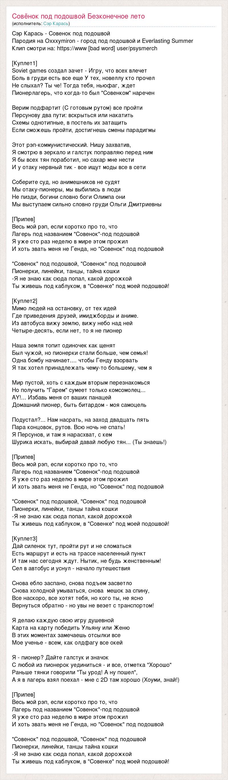 Сэр Карась - Совенок под подошвой Пародия на Oxxxymiron - город под подошвой и Everlasting Summer Клип смотри на: https://www [bad word] user/psysmerch [Куплет1] Soviet games создал зачет - Игру, что всех влечет Боль в груди есть все еще У тех, новеллу кто прочел Не слыхал? Ты че! Тогда тебя, ньюфаг, ждет Пионерлагерь, что когда-то был "Совенком" наречен Верим подфартит (С готовым рутом) все пройти Персунову два пути: вскрыться или накатить Схемы однотипные, в постель их затащить Если сможешь пройти, достигнешь смены парадигмы Этот рэп-коммунистический. Нишу захватив, Я смотрю в зеркало и галстук поправляю перед ним Я бы всех тян поработил, но сахар мне нести И у отаку нервный тик - все ищут моды все в сети Соберите суд, но анимешников не судят Мы отаку-пионеры, мы выбились в люди Не пизди, богини словно боги Олимпа они Мы выступаем сильно словно груди Ольги Дмитриевны [Припев] Весь мой рэп, если коротко про то, что Лагерь под названием "Совенок"-под подошвой Я уже сто раз неделю в мире этом прожил И хоть звать меня не Генда, но "Совенок" под подошвой "Совенок" под подошвой, "Совенок" под подошвой Пионерки, линейки, танцы, тайна кошки -Я не знаю как сюда попал, какой дорожкой Ты живешь под каблуком, в "Совенке" под моей подошвой! [Куплет2] Мимо людей на остановку, от тех идей Где приведения друзей, имиджборды и аниме. Из автобуса вижу землю, вижу небо над ней Четыре-десять, если нет, то я не пионер Наша земля топит одиночек как щенят Был чужой, но пионерки стали больше, чем семья! Одна бомбу начинает.... чтобы Генду взорвать Я так хотел принадлежать чему-то большему, чем я Мир пустой, хоть с каждым вторым перезнакомься Но получить "Гарем" сумеет только комсомолец... AY!... Избавь меня от ваших панацей Домашний пионер, быть битардом - моя самоцель Подустал?... Нам насрать, на заход двадцать пять Пара концовок, рутов. Всю ночь не спать! Я Персунов, и там я нарасхват, с кем Шурика искать, выбирай давай любую тян... (Ты знаешь!) [Припев] Весь мой рэп, если коротко про то, что Лагерь под названием "Совенок"-под подошвой Я уже сто раз неделю в мире этом прожил И хоть звать меня не Генда, но "Совенок" под подошвой "Совенок" под подошвой, "Совенок" под подошвой Пионерки, линейки, танцы тайна кошки -Я не знаю как сюда попал, какой дорожкой Ты живешь под каблуком, в "Совенке" под моей подошвой! [Куплет3] Дай силенок тут, пройти рут и не сломаться Есть маршрут и есть на трассе населенный пункт И там нас сегодня ждут. Нытик, не будь женственным! Сел в автобус и уснул - начало путешествия Снова ебло заспано, снова подъем засветло Снова холодной умываться, снова мешок за спину, Все наскоро, все хотят тебя, но кого ты, не ясно Вернуться обратно - но увы не везет с транспортом! Я делаю каждую свою игру душевной Карта на карту победить Ульяну или Женю В этих моментах замечаешь отсылки все Мое ученье - всем, как олдфагу все окей Я - пионер? Дайте галстук и значок С любой из пионерок уединиться - и все, отметка "Хорошо" Раньше тянки говорили "Ты урод! А ну пошел", А я в лагерь взял поехал - мне с 2D там хорошо (Хоуми, знай!) [Припев] Весь мой рэп, если коротко про то, что Лагерь под названием "Совенок"-под подошвой Я уже сто раз неделю в мире этом прожил И хоть звать меня не Генда, но "Совенок" под подошвой "Совенок" под подошвой, "Совенок" под подошвой Пионерки, линейки, танцы тайна кошки -Я не знаю как сюда попал, какой дорожкой Ты живешь под каблуком, в "Совенке" по