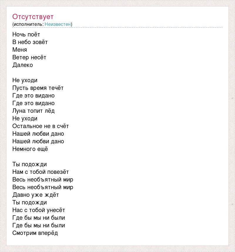 Ночь поёт В небо зовёт Меня Ветер несёт Далеко Не уходи Пусть время течёт Где это видано Где это видано Луна топит лёд Не уходи Остальное не в счёт Нашей любви дано Нашей любви дано Немного ещё Ты подожди Нам с тобой повезёт Весь необъятный мир Весь необъятный мир Давно уже ждёт Ты подожди Нас с тобой унесёт Где бы мы ни были Где бы мы ни были Смотрим вперёд