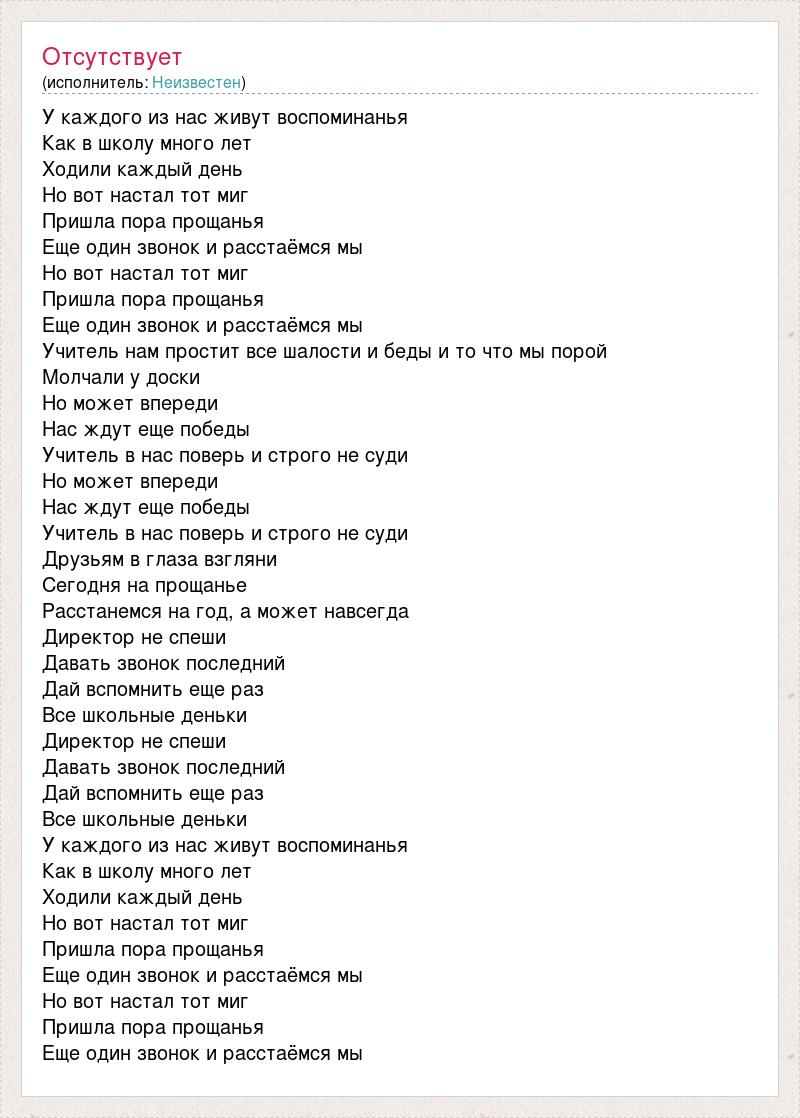 У каждого из нас живут воспоминанья Как в школу много лет Ходили каждый день Но вот настал тот миг Пришла пора прощанья Еще один звонок и расстаёмся мы Но вот настал тот миг Пришла пора прощанья Еще один звонок и расстаёмся мы Учитель нам простит все шалости и беды и то что мы порой Молчали у доски Но может впереди Нас ждут еще победы Учитель в нас поверь и строго не суди Но может впереди Нас ждут еще победы Учитель в нас поверь и строго не суди Друзьям в глаза взгляни Сегодня на прощанье Расстанемся на год, а может навсегда Директор не спеши Давать звонок последний Дай вспомнить еще раз Все школьные деньки Директор не спеши Давать звонок последний Дай вспомнить еще раз Все школьные деньки У каждого из нас живут воспоминанья Как в школу много лет Ходили каждый день Но вот настал тот миг Пришла пора прощанья Еще один звонок и расстаёмся мы Но вот настал тот миг Пришла пора прощанья Еще один звонок и расстаёмся мы