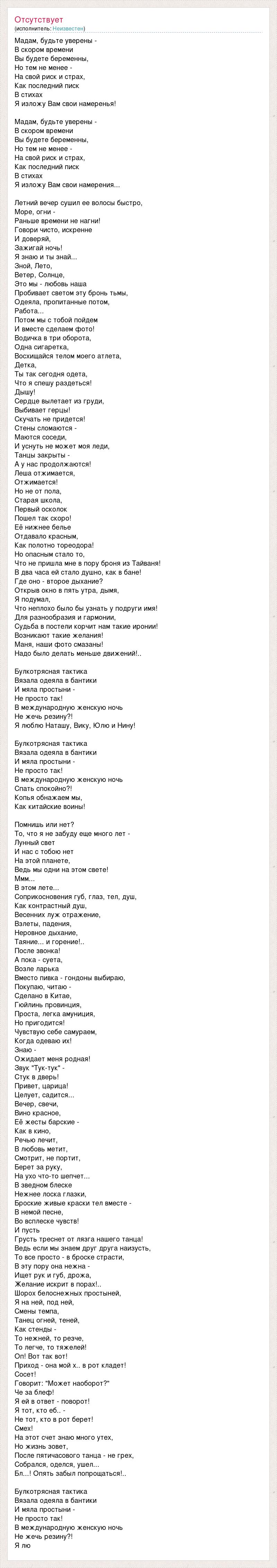 Мадам, будьте уверены - В скором времени Вы будете беременны, Но тем не менее - На свой риск и страх, Как последний писк В стихах Я изложу Вам свои намеренья! Мадам, будьте уверены - В скором времени Вы будете беременны, Но тем не менее - На свой риск и страх, Как последний писк В стихах Я изложу Вам свои намерения... Летний вечер сушил ее волосы быстро, Море, огни - Раньше времени не нагни! Говори чисто, искренне И доверяй, Зажигай ночь! Я знаю и ты знай... Зной, Лето, Ветер, Солнце, Это мы - любовь наша Пробивает светом эту бронь тьмы, Одеяла, пропитанные потом, Работа... Потом мы с тобой пойдем И вместе сделаем фото! Водичка в три оборота, Одна сигаретка, Восхищайся телом моего атлета, Детка, Ты так сегодня одета, Что я спешу раздеться! Дышу! Сердце вылетает из груди, Выбивает герцы! Скучать не придется! Стены сломаются - Маются соседи, И уснуть не может моя леди, Танцы закрыты - А у нас продолжаются! Леша отжимается, Отжимается! Но не от пола, Старая школа, Первый осколок Пошел так скоро! Её нижнее белье Отдавало красным, Как полотно тореодора! Но опасным стало то, Что не пришла мне в пору броня из Тайваня! В два часа ей стало душно, как в бане! Где оно - второе дыхание? Открыв окно в пять утра, дымя, Я подумал, Что неплохо было бы узнать у подруги имя! Для разнообразия и гармонии, Судьба в постели корчит нам такие иронии! Возникают такие желания! Маня, наши фото смазаны! Надо было делать меньше движений!.. Булкотрясная тактика Вязала одеяла в бантики И мяла простыни - Не просто так! В международную женскую ночь Не жечь резину?! Я люблю Наташу, Вику, Юлю и Нину! Булкотрясная тактика Вязала одеяла в бантики И мяла простыни - Не просто так! В международную женскую ночь Спать спокойно?! Копья обнажаем мы, Как китайские воины! Помнишь или нет? То, что я не забуду еще много лет - Лунный свет И нас с тобою нет На этой планете, Ведь мы одни на этом свете! Ммм... В этом лете... Соприкосновения губ, глаз, тел, душ, Как контрастный душ, Весенних луж отражение, Взлеты, падения, Неровное дыхание, Таяние... и горение!.. После звонка! А пока - суета, Возле ларька Вместо пивка - гондоны выбираю, Покупаю, читаю - Сделано в Китае, Гюйлинь провинция, Проста, легка амуниция, Но пригодится! Чувствую себе самураем, Когда одеваю их! Знаю - Ожидает меня родная! Звук "Тук-тук" - Стук в дверь! Привет, царица! Целует, садится... Вечер, свечи, Вино красное, Её жесты барские - Как в кино, Речью лечит, В любовь метит, Смотрит, не портит, Берет за руку, На ухо что-то шепчет... В зведном блеске Нежнее лоска глазки, Броские живые краски тел вместе - В немой песне, Во всплеске чувств! И пусть Грусть треснет от лязга нашего танца! Ведь если мы знаем друг друга наизусть, То все просто - в броске страсти, В эту пору она нежна - Ищет рук и губ, дрожа, Желание искрит в порах!.. Шорох белоснежных простыней, Я на ней, под ней, Смены темпа, Танец огней, теней, Как стенды - То нежней, то резче, То легче, то тяжелей! Оп! Вот так вот! Приход - она мой х.. в рот кладет! Сосет! Говорит: "Может наоборот?" Че за блеф! Я ей в ответ - поворот! Я тот, кто еб.. - Не тот, кто в рот берет! Смех! На этот счет знаю много утех, Но жизнь зовет, После пятичасового танца - не грех, Собрался, оделся, ушел... Бл...! Опять забыл попрощаться!.. Булкотрясная тактика Вязала одеяла в бантики И мяла простыни - Не просто так! В международную женскую ночь Не жечь резину?! Я лю