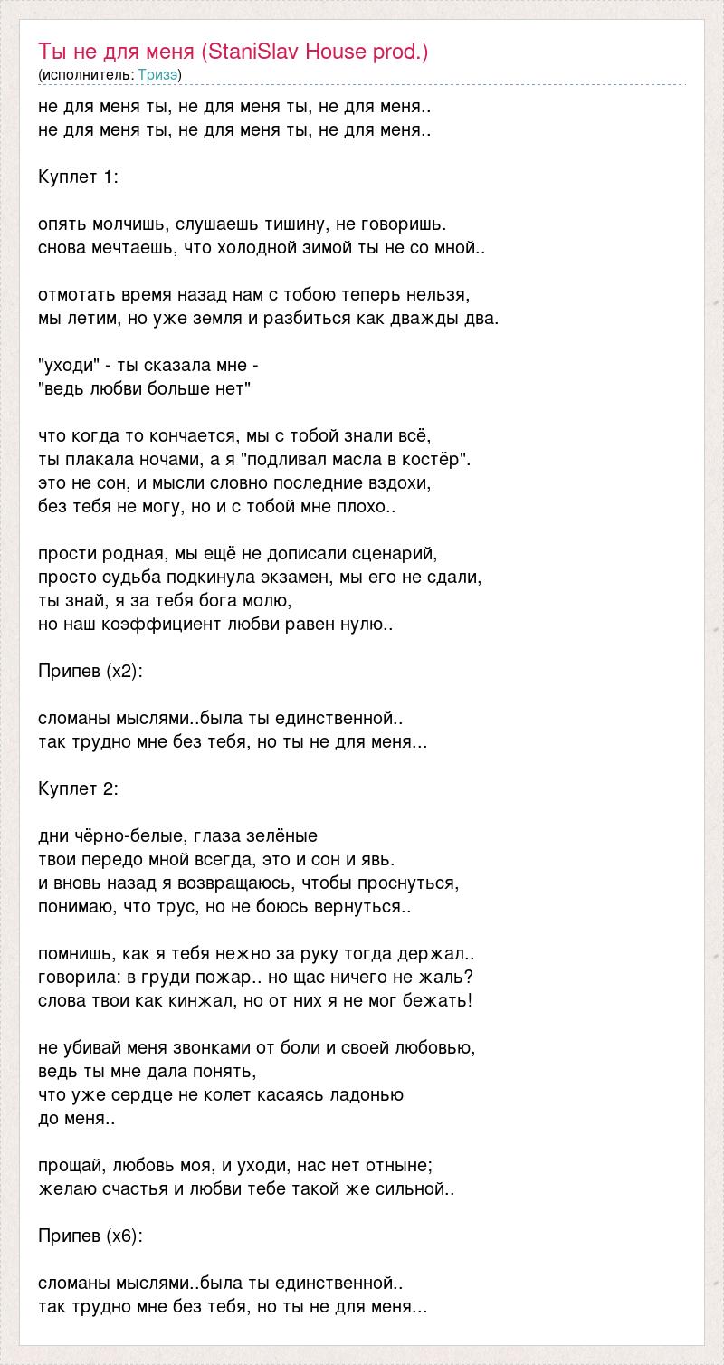 не для меня ты, не для меня ты, не для меня.. не для меня ты, не для меня ты, не для меня.. Куплет 1: опять молчишь, слушаешь тишину, не говоришь. снова мечтаешь, что холодной зимой ты не со мной.. отмотать время назад нам с тобою теперь нельзя, мы летим, но уже земля и разбиться как дважды два. "уходи" - ты сказала мне - "ведь любви больше нет" что когда то кончается, мы с тобой знали всё, ты плакала ночами, а я "подливал масла в костёр". это не сон, и мысли словно последние вздохи, без тебя не могу, но и с тобой мне плохо.. прости родная, мы ещё не дописали сценарий, просто судьба подкинула экзамен, мы его не сдали, ты знай, я за тебя бога молю, но наш коэффициент любви равен нулю.. Припев (х2): сломаны мыслями..была ты единственной.. так трудно мне без тебя, но ты не для меня... Куплет 2: дни чёрно-белые, глаза зелёные твои передо мной всегда, это и сон и явь. и вновь назад я возвращаюсь, чтобы проснуться, понимаю, что трус, но не боюсь вернуться.. помнишь, как я тебя нежно за руку тогда держал.. говорила: в груди пожар.. но щас ничего не жаль? слова твои как кинжал, но от них я не мог бежать! не убивай меня звонками от боли и своей любовью, ведь ты мне дала понять, что уже сердце не колeт касаясь ладонью до меня.. прощай, любовь моя, и уходи, нас нет отныне; желаю счастья и любви тебе такой же сильной.. Припев (х6): сломаны мыслями..была ты единственной.. так трудно мне без тебя, но ты не для меня...