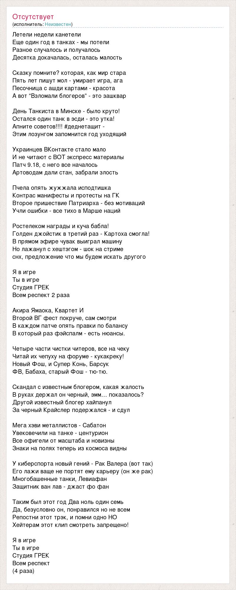Летели недели канетели Еще один год в танках - мы потели Разное случалось и получалось Десятка докачалась, осталась малость Сказку помните? которая, как мир стара Пять лет пишут мол - умирает игра, ага Песочница с ашди картами - красота А вот “Взломали блогеров” - это зашквар День Танкиста в Минске - было круто! Остался один танк в эсди - это утка! Апните советов!!!! #деднетащит - Этим лозунгом запомнится год уходящий Украинцев ВКонтакте стало мало И не читают с ВОТ экспресс материалы Патч 9.18, с него все началось Артоводам дали стан, забрали злость Пчела опять жужжала исподтишка Контрас манифесты и протесты на ГК Второе пришествие Патриарха - без мотиваций Учли ошибки - все тихо в Марше наций Ростелеком награды и куча бабла! Голден джойстик в третий раз - Картоха смогла! В прямом эфире чувак выиграл машину Но лажанул с хештэгом - шок на стриме снх, предложение что мы будем искать другого Я в игре Ты в игре Студия ГРЕК Всем респект 2 раза Акира Ямаока, Квартет И Второй ВГ фест покруче, сам смотри В каждом патче опять правки по балансу В который раз фэйспалм - есть нюансы. Четыре части чистки читеров, все на чеку Читай их чепуху на форуме - кукакреку! Новый Фош, и Супер Конь, Барсук ФВ, Бабаха, старый Фош - тю-тю. Скандал с известным блогером, какая жалость В руках держал он черный, эмм… показалось? Другой известный блогер хайпанул За черный Крайслер подержался - и сдул Мега хэви металлистов - Сабатон Увековечили на танке - центурион Все офигели от масштаба и новизны Знаки на полях теперь из космоса видны У киберспорта новый гений - Рак Валера (вот так) Его лажи ваще не портят ему карьеру (он же рак) Многобашенные танки, Левиафан Защитник ван лав - джаст фо фан Таким был этот год Два ноль один семь Да, безусловно он, понравился но не всем Репостни этот трэк, и помни одно НО Хейтерам этот клип смотреть запрещено! Я в игре Ты в игре Студия ГРЕК Всем респект (4 раза)