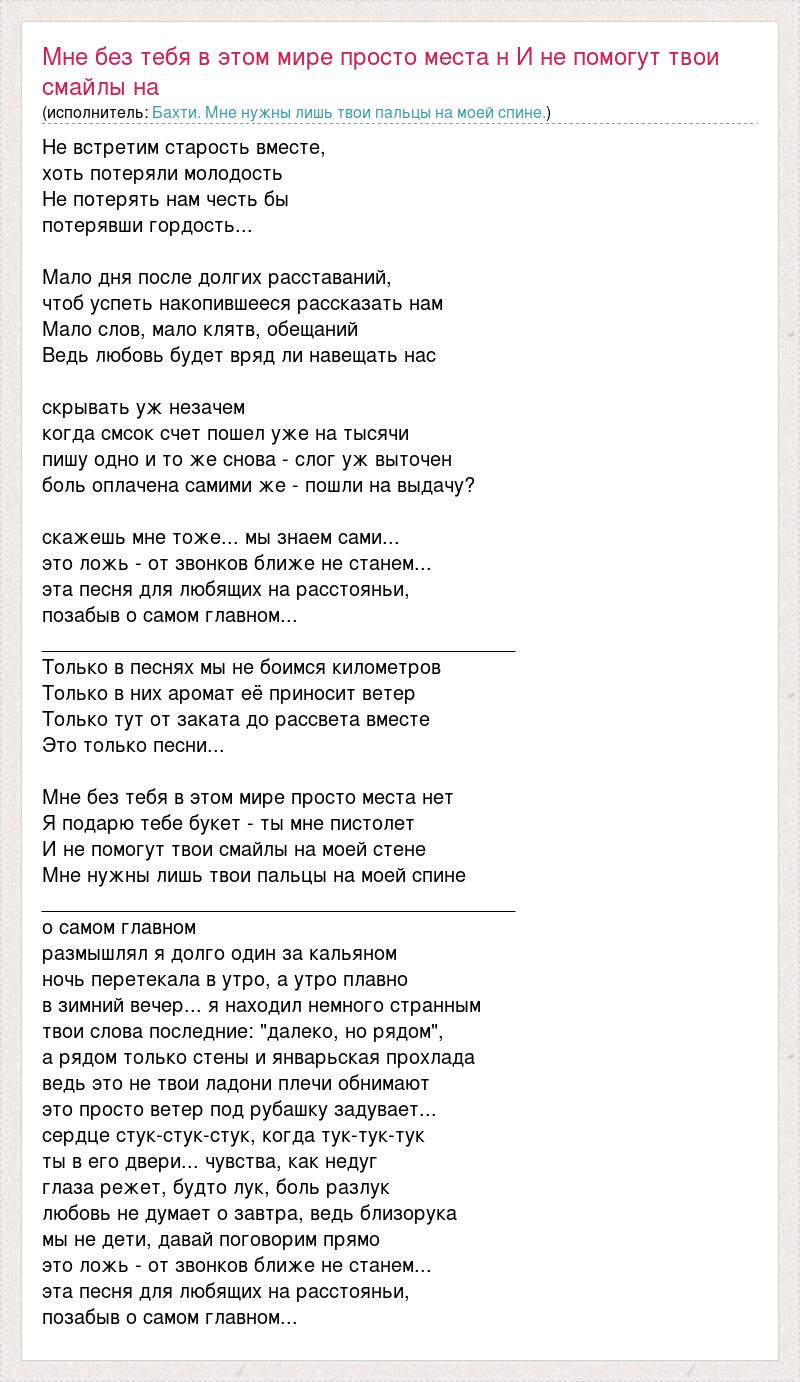 Не встретим старость вместе, хоть потеряли молодость Не потерять нам честь бы потерявши гордость... Мало дня после долгих расставаний, чтоб успеть накопившееся рассказать нам Мало слов, мало клятв, обещаний Ведь любовь будет вряд ли навещать нас скрывать уж незачем когда смсок счет пошел уже на тысячи пишу одно и то же снова - слог уж выточен боль оплачена самими же - пошли на выдачу? скажешь мне тоже... мы знаем сами... это ложь - от звонков ближе не станем... эта песня для любящих на расстояньи, позабыв о самом главном... ___________________________________________ Только в песнях мы не боимся километров Только в них аромат её приносит ветер Только тут от заката до рассвета вместе Это только песни... Мне без тебя в этом мире просто места нет Я подарю тебе букет - ты мне пистолет И не помогут твои смайлы на моей стене Мне нужны лишь твои пальцы на моей спине ___________________________________________ о самом главном размышлял я долго один за кальяном ночь перетекала в утро, а утро плавно в зимний вечер... я находил немного странным твои слова последние: "далеко, но рядом", а рядом только стены и январьская прохлада ведь это не твои ладони плечи обнимают это просто ветер под рубашку задувает... сердце стук-стук-стук, когда тук-тук-тук ты в его двери... чувства, как недуг глаза режет, будто лук, боль разлук любовь не думает о завтра, ведь близорука мы не дети, давай поговорим прямо это ложь - от звонков ближе не станем... эта песня для любящих на расстояньи, позабыв о самом главном...