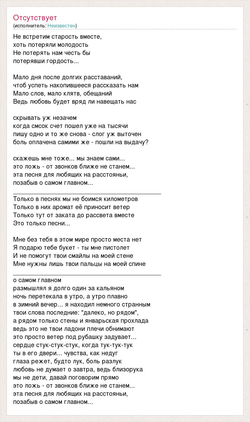 Не встретим старость вместе, хоть потеряли молодость Не потерять нам честь бы потерявши гордость... Мало дня после долгих расставаний, чтоб успеть накопившееся рассказать нам Мало слов, мало клятв, обещаний Ведь любовь будет вряд ли навещать нас скрывать уж незачем когда смсок счет пошел уже на тысячи пишу одно и то же снова - слог уж выточен боль оплачена самими же - пошли на выдачу? скажешь мне тоже... мы знаем сами... это ложь - от звонков ближе не станем... эта песня для любящих на расстояньи, позабыв о самом главном... ___________________________________________ Только в песнях мы не боимся километров Только в них аромат её приносит ветер Только тут от заката до рассвета вместе Это только песни... Мне без тебя в этом мире просто места нет Я подарю тебе букет - ты мне пистолет И не помогут твои смайлы на моей стене Мне нужны лишь твои пальцы на моей спине ___________________________________________ о самом главном размышлял я долго один за кальяном ночь перетекала в утро, а утро плавно в зимний вечер... я находил немного странным твои слова последние: "далеко, но рядом", а рядом только стены и январьская прохлада ведь это не твои ладони плечи обнимают это просто ветер под рубашку задувает... сердце стук-стук-стук, когда тук-тук-тук ты в его двери... чувства, как недуг глаза режет, будто лук, боль разлук любовь не думает о завтра, ведь близорука мы не дети, давай поговорим прямо это ложь - от звонков ближе не станем... эта песня для любящих на расстояньи, позабыв о самом главном...