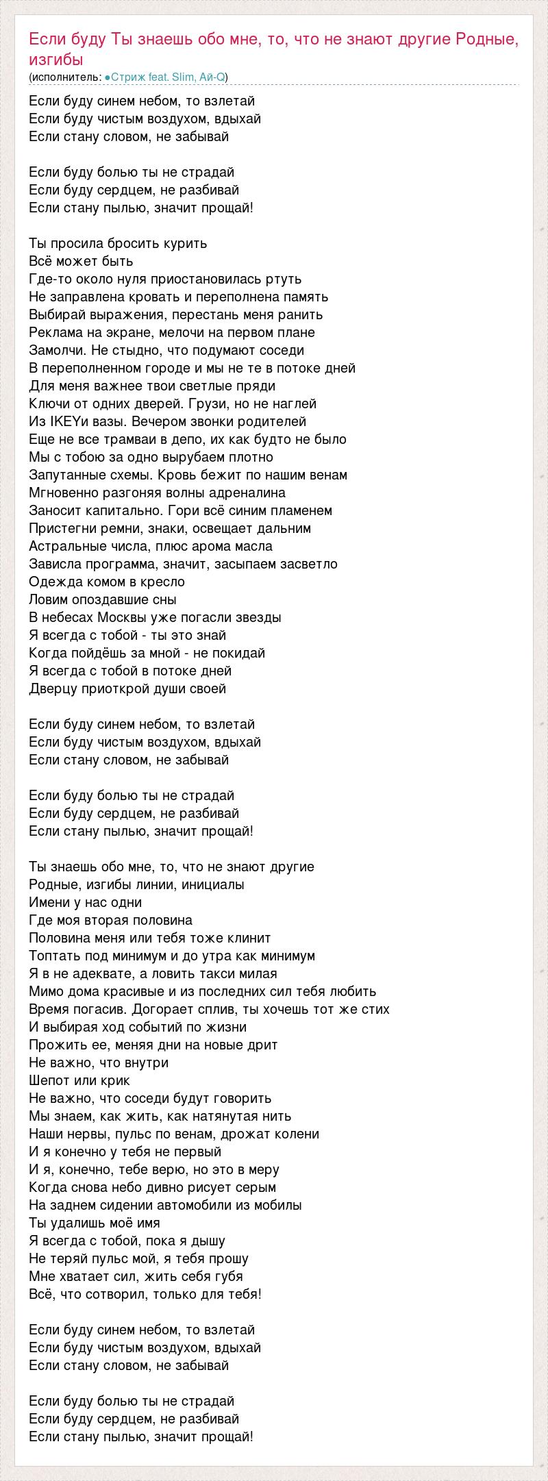 Если буду синем небом, то взлетай Если буду чистым воздухом, вдыхай Если стану словом, не забывай Если буду болью ты не страдай Если буду сердцем, не разбивай Если стану пылью, значит прощай! Ты просила бросить курить Всё может быть Где-то около нуля приостановилась ртуть Не заправлена кровать и переполнена память Выбирай выражения, перестань меня ранить Реклама на экране, мелочи на первом плане Замолчи. Не стыдно, что подумают соседи В переполненном городе и мы не те в потоке дней Для меня важнее твои светлые пряди Ключи от одних дверей. Грузи, но не наглей Из IKEYи вазы. Вечером звонки родителей Еще не все трамваи в депо, их как будто не было Мы с тобою за одно вырубаем плотно Запутанные схемы. Кровь бежит по нашим венам Мгновенно разгоняя волны адреналина Заносит капитально. Гори всё синим пламенем Пристегни ремни, знаки, освещает дальним Астральные числа, плюс арома масла Зависла программа, значит, засыпаем засветло Одежда комом в кресло Ловим опоздавшие сны В небесах Москвы уже погасли звезды Я всегда с тобой - ты это знай Когда пойдёшь за мной - не покидай Я всегда с тобой в потоке дней Дверцу приоткрой души своей Если буду синем небом, то взлетай Если буду чистым воздухом, вдыхай Если стану словом, не забывай Если буду болью ты не страдай Если буду сердцем, не разбивай Если стану пылью, значит прощай! Ты знаешь обо мне, то, что не знают другие Родные, изгибы линии, инициалы Имени у нас одни Где моя вторая половина Половина меня или тебя тоже клинит Топтать под минимум и до утра как минимум Я в не адеквате, а ловить такси милая Мимо дома красивые и из последних сил тебя любить Время погасив. Догорает сплив, ты хочешь тот же стих И выбирая ход событий по жизни Прожить ее, меняя дни на новые дрит Не важно, что внутри Шепот или крик Не важно, что соседи будут говорить Мы знаем, как жить, как натянутая нить Наши нервы, пульс по венам, дрожат колени И я конечно у тебя не первый И я, конечно, тебе верю, но это в меру Когда снова небо дивно рисует серым На заднем сидении автомобили из мобилы Ты удалишь моё имя Я всегда с тобой, пока я дышу Не теряй пульс мой, я тебя прошу Мне хватает сил, жить себя губя Всё, что сотворил, только для тебя! Если буду синем небом, то взлетай Если буду чистым воздухом, вдыхай Если стану словом, не забывай Если буду болью ты не страдай Если буду сердцем, не разбивай Если стану пылью, значит прощай!