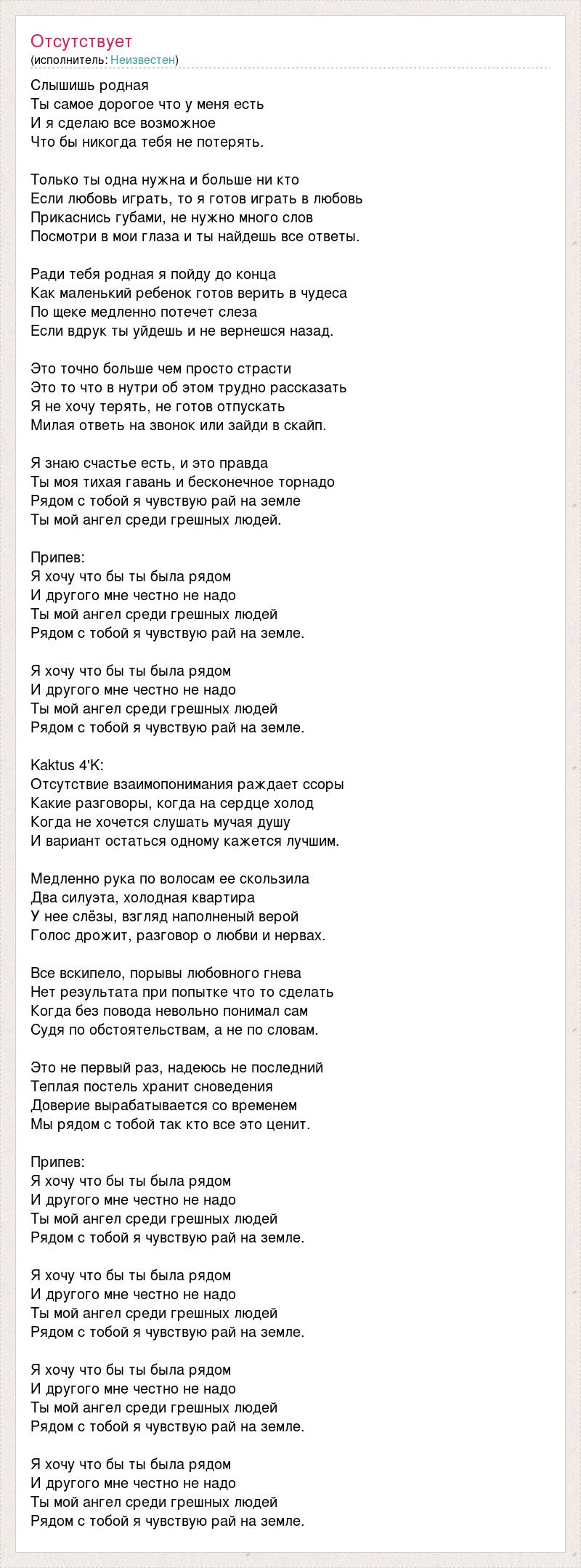Слышишь родная Ты самое дорогое что у меня есть И я сделаю все возможное Что бы никогда тебя не потерять. Только ты одна нужна и больше ни кто Если любовь играть, то я готов играть в любовь Прикаснись губами, не нужно много слов Посмотри в мои глаза и ты найдешь все ответы. Ради тебя родная я пойду до конца Как маленький ребенок готов верить в чудеса По щеке медленно потечет слеза Если вдрук ты уйдешь и не вернешся назад. Это точно больше чем просто страсти Это то что в нутри об этом трудно рассказать Я не хочу терять, не готов отпускать Милая ответь на звонок или зайди в скайп. Я знаю счастье есть, и это правда Ты моя тихая гавань и бесконечное торнадо Рядом с тобой я чувствую рай на земле Ты мой ангел среди грешных людей. Припев: Я хочу что бы ты была рядом И другого мне честно не надо Ты мой ангел среди грешных людей Рядом с тобой я чувствую рай на земле. Я хочу что бы ты была рядом И другого мне честно не надо Ты мой ангел среди грешных людей Рядом с тобой я чувствую рай на земле. Kaktus 4'K: Отсутствие взаимопонимания раждает ссоры Какие разговоры, когда на сердце холод Когда не хочется слушать мучая душу И вариант остаться одному кажется лучшим. Медленно рука по волосам ее скользила Два силуэта, холодная квартира У нее слёзы, взгляд наполненый верой Голос дрожит, разговор о любви и нервах. Все вскипело, порывы любовного гнева Нет результата при попытке что то сделать Когда без повода невольно понимал сам Судя по обстоятельствам, а не по словам. Это не первый раз, надеюсь не последний Теплая постель хранит сноведения Доверие вырабатывается со временем Мы рядом с тобой так кто все это ценит. Припев: Я хочу что бы ты была рядом И другого мне честно не надо Ты мой ангел среди грешных людей Рядом с тобой я чувствую рай на земле. Я хочу что бы ты была рядом И другого мне честно не надо Ты мой ангел среди грешных людей Рядом с тобой я чувствую рай на земле. Я хочу что бы ты была рядом И другого мне честно не надо Ты мой ангел среди грешных людей Рядом с тобой я чувствую рай на земле. Я хочу что бы ты была рядом И другого мне честно не надо Ты мой ангел среди грешных людей Рядом с тобой я чувствую рай на земле.