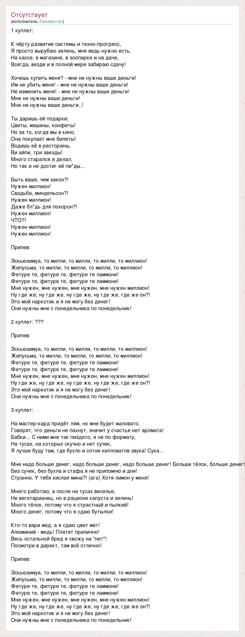 1 куплет: К чёрту развитие системы и техно-прогресс, Я просто вырубаю зелень, мне ведь нужно есть, На кассе, в магазине, в зоопарке и на даче, Всегда, везде и в полной мере забираю сдачу! Хочешь купить меня? - мне не нужны ваши деньги! Им не убить меня! - мне не нужны ваши деньги! Не изменить меня! - мне не нужны ваши деньги! Мне не нужны ваши деньги! Мне не нужны ваши деньги..! Ты даришь ей подарки: Цветы, машины, конфеты! Но за то, когда мы в кино, Она покупает мне билеты! Водишь её в рестораны, Ви айпи, три звезды! Много старался и делал, Но так и не достиг её пи*ды... Быть ваше, чем закон?! Нужен миллион! Свадьба, миндельсон?! Нужен миллион! Даже бл*дь для похорон?! Нужен миллион! ЧТО?! Нужен миллион! Нужен миллион! Припев: Эскьюзимуа, то милли, то милли, то милли, то миллион! Жипусьма, то милли, то милли, то милли, то миллион! Фетуре те, фетуре те, фетуре те ламмоне! Фетуре те, фетуре те, фетуре те ламмоне! Мне нужен, мне нужен, мне нужен, мне нужен миллион! Ну где же, ну где же, ну где же, ну где же, где же он?! Это мой наркотик и я не могу без денег! Они нужны мне с понедельника по понедельник! 2 куплет: ??? Припев: Эскьюзимуа, то милли, то милли, то милли, то миллион! Жипусьма, то милли, то милли, то милли, то миллион! Фетуре те, фетуре те, фетуре те ламмоне! Фетуре те, фетуре те, фетуре те ламмоне! Мне нужен, мне нужен, мне нужен, мне нужен миллион! Ну где же, ну где же, ну где же, ну где же, где же он?! Это мой наркотик и я не могу без денег! Они нужны мне с понедельника по понедельник! 3 куплет: На мастер-кард придёт лям, но мне будет маловато, Говорят, что деньги не пахнут, значит у счастья нет аромата! Бабки... С ними мне так пиздато, я не по формату, На тусах, на которых скучно и нет сучек, Я лучше буду там, где бухло и сотни килловатов звука! Сука... Мне надо больше денег, надо больше денег, надо больше денег! Больше тёлок, больше денег! Без сучек, без бухла и стафа я не припомню и дня! Странно. У тебя кислая мина?! (ага) Хотя лимон у меня! Много работаю, а после на тусах веселье, Не вегетарианец, но в рационе капуста и зелень! Много тёлок, потому что я страстный и пылкий! Много денег, потому что я сдаю бутылки! Кто-то вари мед, а я сдаю цвет мет! Алюминий - медь! Платят прилично! Весь остальной бред я свожу на "нет"! Посмотри в директ, там всё отлично! Припев: Эскьюзимуа, то милли, то милли, то милли, то миллион! Жипусьма, то милли, то милли, то милли, то миллион! Фетуре те, фетуре те, фетуре те ламмоне! Фетуре те, фетуре те, фетуре те ламмоне! Мне нужен, мне нужен, мне нужен, мне нужен миллион! Ну где же, ну где же, ну где же, ну где же, где же он?! Это мой наркотик и я не могу без денег! Они нужны мне с понедельника по понедельник!