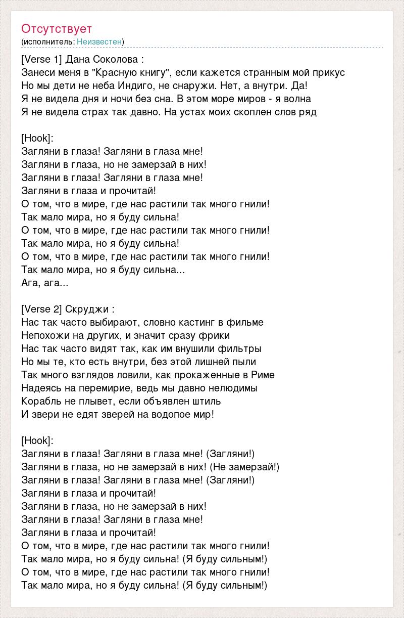[Verse 1] Дана Соколова : Занеси меня в "Красную книгу", если кажется странным мой прикус Но мы дети не неба Индиго, не снаружи. Нет, а внутри. Да! Я не видела дня и ночи без сна. В этом море миров - я волна Я не видела страх так давно. На устах моих скоплен слов ряд [Hook]: Загляни в глаза! Загляни в глаза мне! Загляни в глаза, но не замерзай в них! Загляни в глаза! Загляни в глаза мне! Загляни в глаза и прочитай! О том, что в мире, где нас растили так много гнили! Так мало мира, но я буду сильна! О том, что в мире, где нас растили так много гнили! Так мало мира, но я буду сильна! О том, что в мире, где нас растили так много гнили! Так мало мира, но я буду сильна... Ага, ага... [Verse 2] Скруджи : Нас так часто выбирают, словно кастинг в фильме Непохожи на других, и значит сразу фрики Нас так часто видят так, как им внушили фильтры Но мы те, кто есть внутри, без этой лишней пыли Так много взглядов ловили, как прокаженные в Риме Надеясь на перемирие, ведь мы давно нелюдимы Корабль не плывет, если объявлен штиль И звери не едят зверей на водопое мир! [Hook]: Загляни в глаза! Загляни в глаза мне! (Загляни!) Загляни в глаза, но не замерзай в них! (Не замерзай!) Загляни в глаза! Загляни в глаза мне! (Загляни!) Загляни в глаза и прочитай! Загляни в глаза, но не замерзай в них! Загляни в глаза! Загляни в глаза мне! Загляни в глаза и прочитай! О том, что в мире, где нас растили так много гнили! Так мало мира, но я буду сильна! (Я буду сильным!) О том, что в мире, где нас растили так много гнили! Так мало мира, но я буду сильна! (Я буду сильным!)