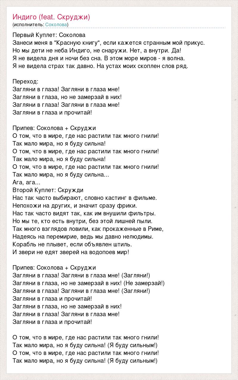 Первый Куплет: Соколова Занеси меня в "Красную книгу", если кажется странным мой прикус. Но мы дети не неба Индиго, не снаружи. Нет, а внутри. Да! Я не видела дня и ночи без сна. В этом море миров - я волна. Я не видела страх так давно. На устах моих скоплен слов ряд. Переход: Загляни в глаза! Загляни в глаза мне! Загляни в глаза, но не замерзай в них! Загляни в глаза! Загляни в глаза мне! Загляни в глаза и прочитай! Припев: Соколова + Скруджи О том, что в мире, где нас растили так много гнили! Так мало мира, но я буду сильна! О том, что в мире, где нас растили так много гнили! Так мало мира, но я буду сильна! О том, что в мире, где нас растили так много гнили! Так мало мира, но я буду сильна... Ага, ага... Второй Куплет: Скружди Нас так часто выбирают, словно кастинг в фильме. Непохожи на других, и значит сразу фрики. Нас так часто видят так, как им внушили фильтры. Но мы те, кто есть внутри, без этой лишней пыли. Так много взглядов ловили, как прокаженные в Риме, Надеясь на перемирие, ведь мы давно нелюдимы. Корабль не плывет, если объявлен штиль. И звери не едят зверей на водопоев мир! Припев: Соколова + Скруджи Загляни в глаза! Загляни в глаза мне! (Загляни!) Загляни в глаза, но не замерзай в них! (Не замерзай!) Загляни в глаза! Загляни в глаза мне! (Загляни!) Загляни в глаза и прочитай! Загляни в глаза, но не замерзай в них! Загляни в глаза! Загляни в глаза мне! Загляни в глаза и прочитай! О том, что в мире, где нас растили так много гнили! Так мало мира, но я буду сильна! (Я буду сильным!) О том, что в мире, где нас растили так много гнили! Так мало мира, но я буду сильна! (Я буду сильным!)