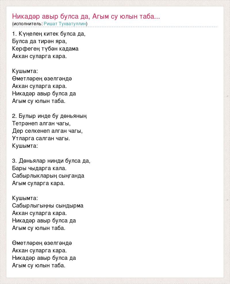 1. Күңелең китек булса да, Булса да тирән яра, Керфегең түбән кадама Аккан суларга кара. Кушымта: Өметләрең өзелгәндә Аккан суларга кара. Никадәр авыр булса да Агым су юлын таба. 2. Булыр инде бу дөньяның Тетрәнеп алган чагы, Дер селкенеп алган чагы, Утларга салган чагы. Кушымта: 3. Дөньялар нинди булса да, Бары чыдарга кала. Сабырлыкларың сыңганда Агым суларга кара. Кушымта: Сабырлыгыңны сындырма Аккан суларга кара. Никадәр авыр булса да Агым су юлын таба. Өметләрең өзелгәндә Аккан суларга кара. Никадәр авыр булса да Агым су юлын таба.