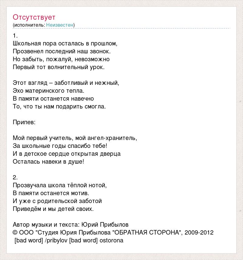 1. Школьная пора осталась в прошлом, Прозвенел последний наш звонок. Но забыть, пожалуй, невозможно Первый тот волнительный урок. Этот взгляд – заботливый и нежный, Эхо материнского тепла. В памяти останется навечно То, что ты нам подарить смогла. Припев: Мой первый учитель, мой ангел-хранитель, За школьные годы спасибо тебе! И в детское сердце открытая дверца Осталась навеки в душе! 2. Прозвучала школа тёплой нотой, В памяти останется мотив. И уже с родительской заботой Приведём и мы детей своих. Автор музыки и текста: Юрий Прибылов © ООО "Студия Юрия Прибылова "ОБРАТНАЯ СТОРОНА", 2009-2012 [bad word] /pribylov [bad word] ostorona