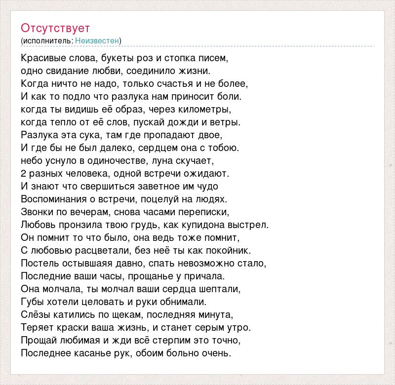 Красивые слова, букеты роз и стопка писем, одно свидание любви, соединило жизни. Когда ничто не надо, только счастья и не более, И как то подло что разлука нам приносит боли. когда ты видишь её образ, через километры, когда тепло от её слов, пускай дожди и ветры. Разлука эта сука, там где пропадают двое, И где бы не был далеко, сердцем она с тобою. небо уснуло в одиночестве, луна скучает, 2 разных человека, одной встречи ожидают. И знают что свершиться заветное им чудо Воспоминания о встречи, поцелуй на людях. Звонки по вечерам, снова часами переписки, Любовь пронзила твою грудь, как купидона выстрел. Он помнит то что было, она ведь тоже помнит, С любовью расцветали, без неё ты как покойник. Постель остывшаяя давно, спать невозможно стало, Последние ваши часы, прощанье у причала. Она молчала, ты молчал ваши сердца шептали, Губы хотели целовать и руки обнимали. Слёзы катились по щекам, последняя минута, Теряет краски ваша жизнь, и станет серым утро. Прощай любимая и жди всё стерпим это точно, Последнее касанье рук, обоим больно очень.