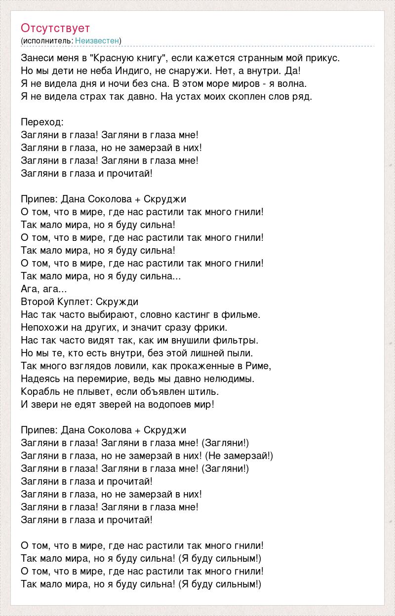 Занеси меня в "Красную книгу", если кажется странным мой прикус. Но мы дети не неба Индиго, не снаружи. Нет, а внутри. Да! Я не видела дня и ночи без сна. В этом море миров - я волна. Я не видела страх так давно. На устах моих скоплен слов ряд. Переход: Загляни в глаза! Загляни в глаза мне! Загляни в глаза, но не замерзай в них! Загляни в глаза! Загляни в глаза мне! Загляни в глаза и прочитай! Припев: Дана Соколова + Скруджи О том, что в мире, где нас растили так много гнили! Так мало мира, но я буду сильна! О том, что в мире, где нас растили так много гнили! Так мало мира, но я буду сильна! О том, что в мире, где нас растили так много гнили! Так мало мира, но я буду сильна... Ага, ага... Второй Куплет: Скружди Нас так часто выбирают, словно кастинг в фильме. Непохожи на других, и значит сразу фрики. Нас так часто видят так, как им внушили фильтры. Но мы те, кто есть внутри, без этой лишней пыли. Так много взглядов ловили, как прокаженные в Риме, Надеясь на перемирие, ведь мы давно нелюдимы. Корабль не плывет, если объявлен штиль. И звери не едят зверей на водопоев мир! Припев: Дана Соколова + Скруджи Загляни в глаза! Загляни в глаза мне! (Загляни!) Загляни в глаза, но не замерзай в них! (Не замерзай!) Загляни в глаза! Загляни в глаза мне! (Загляни!) Загляни в глаза и прочитай! Загляни в глаза, но не замерзай в них! Загляни в глаза! Загляни в глаза мне! Загляни в глаза и прочитай! О том, что в мире, где нас растили так много гнили! Так мало мира, но я буду сильна! (Я буду сильным!) О том, что в мире, где нас растили так много гнили! Так мало мира, но я буду сильна! (Я буду сильным!)