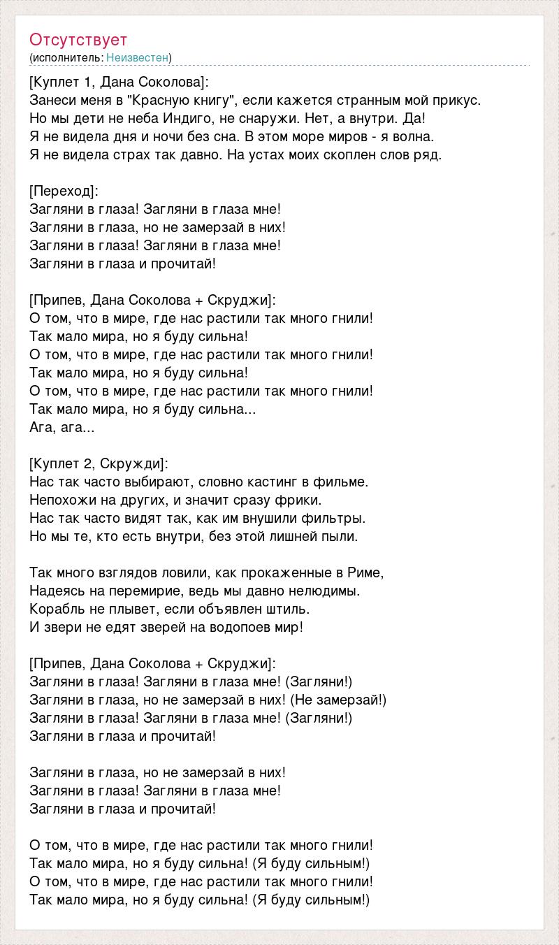 [Куплет 1, Дана Соколова]: Занеси меня в "Красную книгу", если кажется странным мой прикус. Но мы дети не неба Индиго, не снаружи. Нет, а внутри. Да! Я не видела дня и ночи без сна. В этом море миров - я волна. Я не видела страх так давно. На устах моих скоплен слов ряд. [Переход]: Загляни в глаза! Загляни в глаза мне! Загляни в глаза, но не замерзай в них! Загляни в глаза! Загляни в глаза мне! Загляни в глаза и прочитай! [Припев, Дана Соколова + Скруджи]: О том, что в мире, где нас растили так много гнили! Так мало мира, но я буду сильна! О том, что в мире, где нас растили так много гнили! Так мало мира, но я буду сильна! О том, что в мире, где нас растили так много гнили! Так мало мира, но я буду сильна... Ага, ага... [Куплет 2, Скружди]: Нас так часто выбирают, словно кастинг в фильме. Непохожи на других, и значит сразу фрики. Нас так часто видят так, как им внушили фильтры. Но мы те, кто есть внутри, без этой лишней пыли. Так много взглядов ловили, как прокаженные в Риме, Надеясь на перемирие, ведь мы давно нелюдимы. Корабль не плывет, если объявлен штиль. И звери не едят зверей на водопоев мир! [Припев, Дана Соколова + Скруджи]: Загляни в глаза! Загляни в глаза мне! (Загляни!) Загляни в глаза, но не замерзай в них! (Не замерзай!) Загляни в глаза! Загляни в глаза мне! (Загляни!) Загляни в глаза и прочитай! Загляни в глаза, но не замерзай в них! Загляни в глаза! Загляни в глаза мне! Загляни в глаза и прочитай! О том, что в мире, где нас растили так много гнили! Так мало мира, но я буду сильна! (Я буду сильным!) О том, что в мире, где нас растили так много гнили! Так мало мира, но я буду сильна! (Я буду сильным!)