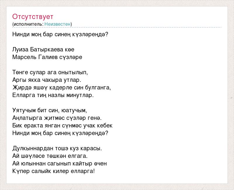 Нинди моң бар синең күзләреңдә? Луиза Батыркаева көе Марсель Галиев сүзләре Төнге сулар ага онытылып, Аргы якка чакыра утлар. Җирдә яшәү кадерле син булганга, Елларга тиң назлы минутлар. Уятучым бит син, юатучым, Аңлатырга җитмәс сүзләр генә. Бик еракта янган сүнмәс учак кебек Нинди моң бар синең күзләреңдә? Дулкыннардан тошэ куз карасы. Ай шәүләсе төшкән елгага. Ай юлыннан сагынып кайтыр өчен Күпер салыйк килер елларга!