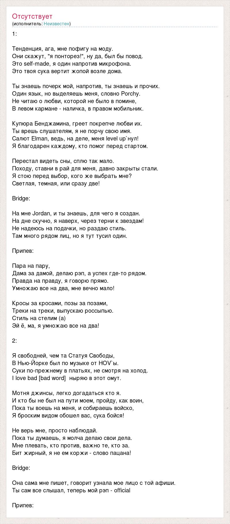 1: Тенденция, ага, мне пофигу на моду. Они скажут, "я понторез!", ну да, был бы повод. Это self-made, я один напротив микрофона. Это твоя сука вертит жопой возле дома. Ты знаешь почерк мой, напротив, ты знаешь и прочих. Один язык, но выделяешь меня, словно Porchy. Не читаю о любви, которой не было в помине, В левом кармане - наличка, в правом мобильник. Купюра Бенджамина, греет покрепче любви их. Ты врешь слушателям, я не порчу свою имя. Салют Elman, ведь, на деле, меня level up`нул! Я благодарен каждому, кто помог перед стартом. Перестал видеть сны, сплю так мало. Походу, ставни в рай для меня, давно закрыты стали. Я стою перед выбор, кого же выбрать мне? Светлая, темная, или сразу две! Bridge: На мне Jordan, и ты знаешь, для чего я создан. На дне скучно, я наверх, через терни к звездам! Не надеюсь на подачки, но раздаю стиль. Там много рядом лиц, но я тут тусил один. Припев: Пара на пару, Дама за дамой, делаю рэп, а успех где-то рядом. Правда на правду, я говорю прямо. Умножаю все на два, мне вечно мало! Кросы за кросами, позы за позами, Треки на треки, выпускаю россыпью. Стиль на стелим (а) Эй ё, ма, я умножаю все на два! 2: Я свободней, чем та Статуя Свободы, В Нью-Йорке был по музыке от HOV`ы. Суки по-прежнему в платьях, не смотря на холод. I love bad [bad word] ныряю в этот омут. Мотня джинсы, легко догадаться кто я. И кто бы не был на пути моем, пройду, как воин, Пока ты воешь на меня, и собираешь войско, Я броским видом обошел вас, сука бойся! Не верь мне, просто наблюдай. Пока ты думаешь, я молча делаю свои дела. Мне плевать, кто против, важно те, кто за. Бит жирный, я не ем коржи - слово пацана! Bridge: Она сама мне пишет, говорит узнала мое лицо с той афиши. Ты сам все слышал, теперь мой рэп - official Припев:
