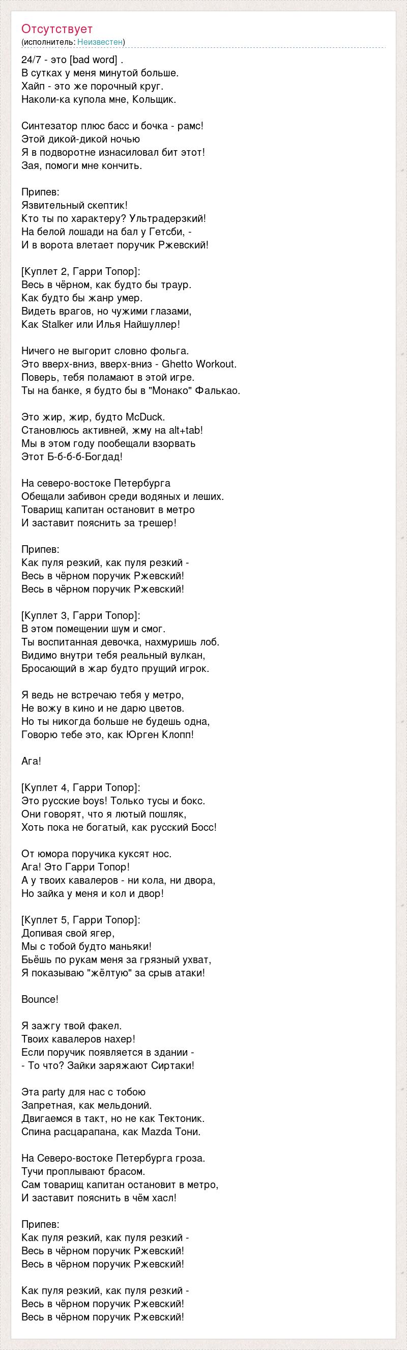 24/7 - это [bad word] . В сутках у меня минутой больше. Хайп - это же порочный круг. Наколи-ка купола мне, Кольщик. Синтезатор плюс басс и бочка - рамс! Этой дикой-дикой ночью Я в подворотне изнасиловал бит этот! Зая, помоги мне кончить. Припев: Язвительный скептик! Кто ты по характеру? Ультрадерзкий! На белой лошади на бал у Гетсби, - И в ворота влетает поручик Ржевский! [Куплет 2, Гарри Топор]: Весь в чёрном, как будто бы траур. Как будто бы жанр умер. Видеть врагов, но чужими глазами, Как Stalker или Илья Найшуллер! Ничего не выгорит словно фольга. Это вверх-вниз, вверх-вниз - Ghetto Workout. Поверь, тебя поламают в этой игре. Ты на банке, я будто бы в "Монако" Фалькао. Это жир, жир, будто McDuck. Становлюсь активней, жму на alt+tab! Мы в этом году пообещали взорвать Этот Б-б-б-б-Богдад! На северо-востоке Петербурга Обещали забивон среди водяных и леших. Товарищ капитан остановит в метро И заставит пояснить за трешер! Припев: Как пуля резкий, как пуля резкий - Весь в чёрном поручик Ржевский! Весь в чёрном поручик Ржевский! [Куплет 3, Гарри Топор]: В этом помещении шум и смог. Ты воспитанная девочка, нахмуришь лоб. Видимо внутри тебя реальный вулкан, Бросающий в жар будто прущий игрок. Я ведь не встречаю тебя у метро, Не вожу в кино и не дарю цветов. Но ты никогда больше не будешь одна, Говорю тебе это, как Юрген Клопп! Ага! [Куплет 4, Гарри Топор]: Это русские boys! Только тусы и бокс. Они говорят, что я лютый пошляк, Хоть пока не богатый, как русский Босс! От юмора поручика куксят нос. Ага! Это Гарри Топор! А у твоих кавалеров - ни кола, ни двора, Но зайка у меня и кол и двор! [Куплет 5, Гарри Топор]: Допивая свой ягер, Мы с тобой будто маньяки! Бьёшь по рукам меня за грязный ухват, Я показываю "жёлтую" за срыв атаки! Bounce! Я зажгу твой факел. Твоих кавалеров нахер! Если поручик появляется в здании - - То что? Зайки заряжают Сиртаки! Эта party для нас с тобою Запретная, как мельдоний. Двигаемся в такт, но не как Тектоник. Спина расцарапана, как Mazda Тони. На Северо-востоке Петербурга гроза. Тучи проплывают брасом. Сам товарищ капитан остановит в метро, И заставит пояснить в чём хасл! Припев: Как пуля резкий, как пуля резкий - Весь в чёрном поручик Ржевский! Весь в чёрном поручик Ржевский! Как пуля резкий, как пуля резкий - Весь в чёрном поручик Ржевский! Весь в чёрном поручик Ржевский!