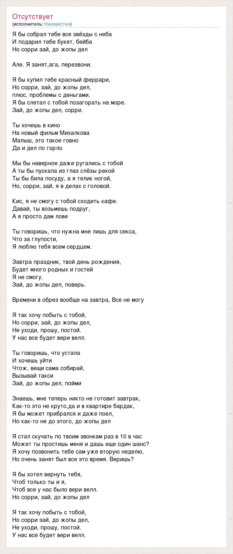 Я бы собрал тебе все звёзды с неба И подарил тебе букет, бейба Но сорри зай, до жопы дел Але. Я занят,ага, перезвони. Я бы купил тебе красный феррари, Но сорри, зай, до жопы дел, плюс, проблемы с деньгами. Я бы слетал с тобой позагорать на море. Зай, до жопы дел, сорри. Ты хочешь в кино На новый фильм Михалкова Малыш, это такое говно Да и дел по горло Мы бы наверное даже ругались с тобой А ты бы пускала из глаз слёзы рекой Ты бы била посуду, а я телик ногой, Но, сорри, зай, я в делах с головой. Кис, я не смогу с тобой сходить кафе. Давай, ты возьмешь подруг, А я просто дам лове Ты говоришь, что нужна мне лишь для секса, Что за глупости, Я люблю тебя всем сердцем. Завтра праздник, твой день рождения, Будет много родных и гостей Я не смогу. Зай, до жопы дел, поверь. Времени в обрез вообще на завтра, Все не могу Я так хочу побыть с тобой, Но сорри, зай, до жопы дел, Не уходи, прошу, постой. У нас все будет вери велл. Ты говоришь, что устала И хочешь уйти Чтож, вещи сама собирай, Вызывай такси Зай, до жопы дел, пойми Знаешь, мне теперь никто не готовит завтрак, Как-то это не круто,да и в квартире бардак, Я бы может прибрался и даже поел, Но как-то не до этого, до жопы дел Я стал скучать по твоим звонкам раз в 10 в час Может ты простишь меня и дашь еще один шанс? Я хочу позвонить тебе сам уже вторую неделю, Но очень занят был все это время. Веришь? Я бы хотел вернуть тебя, Чтоб только ты и я, Чтоб все у нас было вери велл. Но сорри, зай, до жопы дел Я так хочу побыть с тобой, Но сорри зай, до жопы дел, Не уходи, прошу, постой. У нас все будет вери велл.