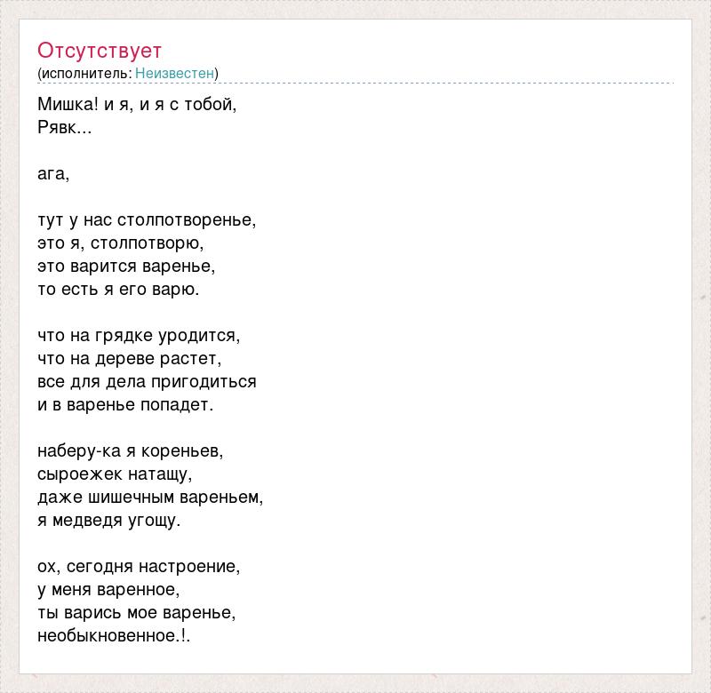 Мишка! и я, и я с тобой, Рявк... ага, тут у нас столпотворенье, это я, столпотворю, это варится варенье, то есть я его варю. что на грядке уродится, что на дереве растет, все для дела пригодиться и в варенье попадет. наберу-ка я кореньев, сыроежек натащу, даже шишечным вареньем, я медведя угощу. ох, сегодня настроение, у меня варенное, ты варись мое варенье, необыкновенное.!.