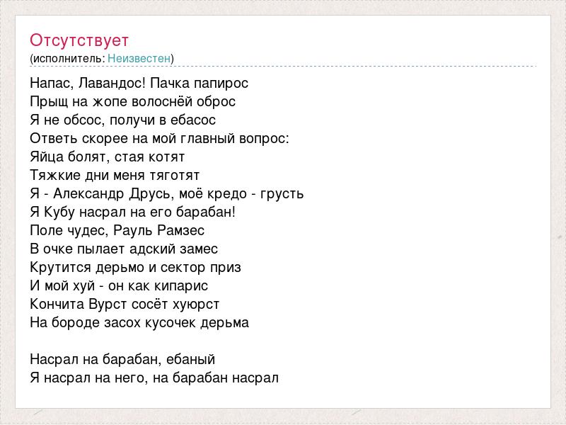 Напас, Лавандос! Пачка папирос Прыщ на жопе волоснёй оброс Я не обсос, получи в ебасос Ответь скорее на мой главный вопрос: Яйца болят, стая котят Тяжкие дни меня тяготят Я - Александр Друсь, моё кредо - грусть Я Кубу насрал на его барабан! Поле чудес, Рауль Рамзес В очке пылает адский замес Крутится дерьмо и сектор приз И мой хуй - он как кипарис Кончита Вурст сосёт хуюрст На бороде засох кусочек дерьма Насрал на барабан, ебаный Я насрал на него, на барабан насрал