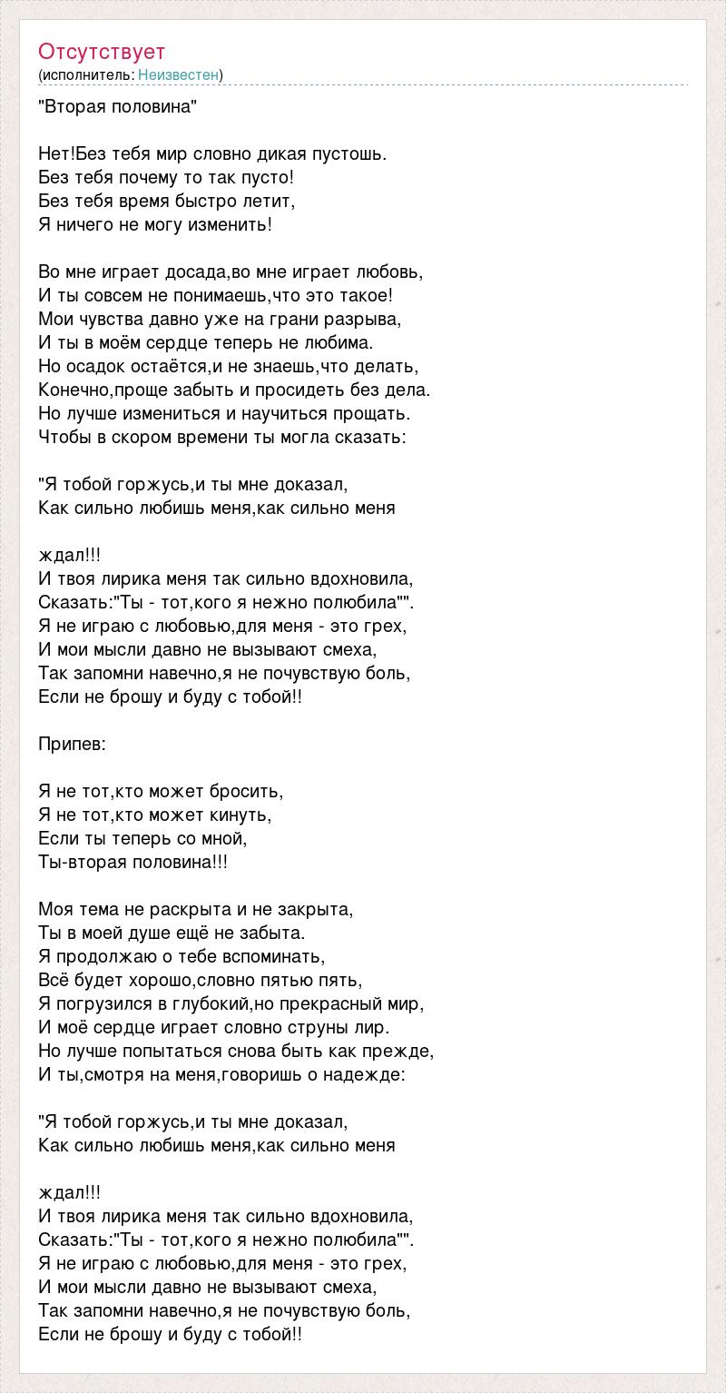 "Вторая половина" Нет!Без тебя мир словно дикая пустошь. Без тебя почему то так пусто! Без тебя время быстро летит, Я ничего не могу изменить! Во мне играет досада,во мне играет любовь, И ты совсем не понимаешь,что это такое! Мои чувства давно уже на грани разрыва, И ты в моём сердце теперь не любима. Но осадок остаётся,и не знаешь,что делать, Конечно,проще забыть и просидеть без дела. Но лучше измениться и научиться прощать. Чтобы в скором времени ты могла сказать: "Я тобой горжусь,и ты мне доказал, Как сильно любишь меня,как сильно меня ждал!!! И твоя лирика меня так сильно вдохновила, Сказать:"Ты - тот,кого я нежно полюбила"". Я не играю с любовью,для меня - это грех, И мои мысли давно не вызывают смеха, Так запомни навечно,я не почувствую боль, Если не брошу и буду с тобой!! Припев: Я не тот,кто может бросить, Я не тот,кто может кинуть, Если ты теперь со мной, Ты-вторая половина!!! Моя тема не раскрыта и не закрыта, Ты в моей душе ещё не забыта. Я продолжаю о тебе вспоминать, Всё будет хорошо,словно пятью пять, Я погрузился в глубокий,но прекрасный мир, И моё сердце играет словно струны лир. Но лучше попытаться снова быть как прежде, И ты,смотря на меня,говоришь о надежде: "Я тобой горжусь,и ты мне доказал, Как сильно любишь меня,как сильно меня ждал!!! И твоя лирика меня так сильно вдохновила, Сказать:"Ты - тот,кого я нежно полюбила"". Я не играю с любовью,для меня - это грех, И мои мысли давно не вызывают смеха, Так запомни навечно,я не почувствую боль, Если не брошу и буду с тобой!!