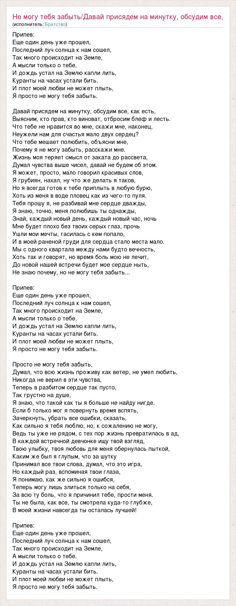 Припев: Еще один день уже прошел, Последний луч солнца к нам сошел, Так много происходит на Земле, А мысли только о тебе. И дождь устал на Землю капли лить, Куранты на часах устали бить. И плот моей любви не может плыть, Я просто не могу тебя забыть. Давай присядем на минутку, обсудим все, как есть, Выясним, кто прав, кто виноват, отбросим блеф и лесть. Что тебе не нравится во мне, скажи мне, наконец, Неужели нам для счастья мало двух сердец? Что тебе мешает полюбить, объясни мне, Почему я не могу забыть, расскажи мне. Жизнь моя теряет смысл от заката до рассвета, Думал чувства выше чисел, давай не будем об этом. Я может, просто, мало говорил красивых слов, Я грубиян, нахал, ну что же делать я таков, Но я всегда готов к тебе приплыть в любую бурю, Хоть из меня в воде пловец как из чего-то пуля. Тебя прошу я, не разбивай мне сердце дважды, Я знаю, точно, меня полюбишь ты однажды, Знай, каждый новый день, каждый новый час, ночь Мне будет плохо без твоих серых глаз, прочь Ушли мои мечты, гасилась с кем попало, И в моей раненой груди для сердца стало места мало. Мы с одного квартала между нами будто вечность, Хоть так и говорят, но время боль мою не лечит, До новой нашей встречи будет мое сердце ныть, Не знаю почему, но не могу тебя забыть... Припев: Еще один день уже прошел, Последний луч солнца к нам сошел, Так много происходит на Земле, А мысли только о тебе. И дождь устал на Землю капли лить, Куранты на часах устали бить. И плот моей любви не может плыть, Я просто не могу тебя забыть. Просто не могу тебя забыть, Думал, что всю жизнь проживу как ветер, не умел любить, Никогда не верил в эти чувства, Теперь в разбитом сердце так пусто, Так грустно на душе, Я знаю, что такой как ты я больше не найду нигде. Если б только мог я повернуть время вспять, Зачеркнуть, убрать все ошибки, сказать, Как сильно я тебя люблю, но, к сожалению не могу, Ведь ты уже не рядом, с тех пор жизнь превратилась в ад, В каждой встречной девчонке ищу твой взгляд, Твою улыбку, твоя любовь для меня обернулась пыткой, Каким же был я глупым, что за шутку Принимал все твои слова, думал, что это игра, Но каждый раз, вспоминая твои глаза, Я понимаю, как же сильно я ошибся, Теперь могу лишь злиться только на себя, За всю ту боль, что я причинил тебе, прости меня. Ты не была, как все, ты смотрела куда-то глубже, В моей жизни навсегда ты осталась лучшей! Припев: Еще один день уже прошел, Последний луч солнца к нам сошел, Так много происходит на Земле, А мысли только о тебе. И дождь устал на Землю капли лить, Куранты на часах устали бить. И плот моей любви не может плыть, Я просто не могу тебя забыть.