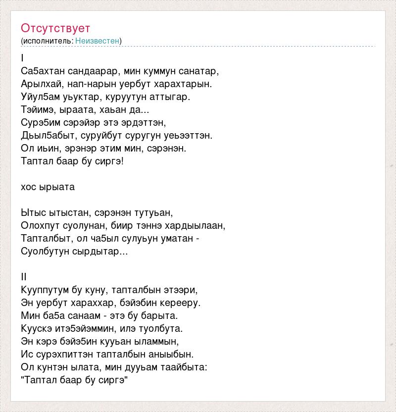 I Са5ахтан сандаарар, мин куммун санатар, Арылхай, нап-нарын уербут харахтарын. Уйул5ам уьуктар, куруутун аттыгар. Тэйимэ, ыраата, хаьан да... Сурэ5им сэрэйэр этэ эрдэттэн, Дьыл5абыт, суруйбут суругун уеьээттэн. Ол иьин, эрэнэр этим мин, сэрэнэн. Таптал баар бу сиргэ! хос ырыата Ытыс ытыстан, сэрэнэн тутуьан, Олохпут суолунан, биир тэннэ хардыылаан, Тапталбыт, ол ча5ыл сулуьун уматан - Суолбутун сырдытар... II Кууппутум бу куну, тапталбын этээри, Эн уербут хараххар, бэйэбин керееру. Мин ба5а санаам - этэ бу барыта. Куускэ итэ5эйэммин, илэ туолбута. Эн кэрэ бэйэ5ин кууьан ыламмын, Ис сурэхпиттэн тапталбын аныыбын. Ол кунтэн ылата, мин дууьам таайбыта: "Таптал баар бу сиргэ"