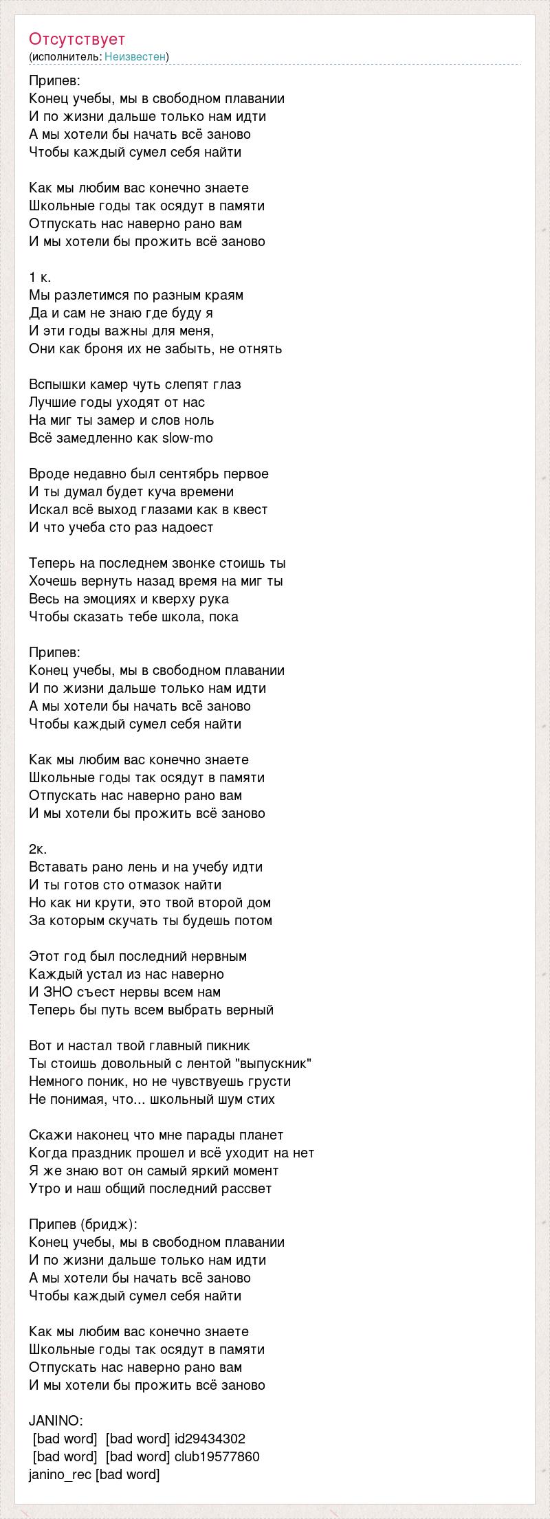 Припев: Конец учебы, мы в свободном плавании И по жизни дальше только нам идти А мы хотели бы начать всё заново Чтобы каждый сумел себя найти Как мы любим вас конечно знаете Школьные годы так осядут в памяти Отпускать нас наверно рано вам И мы хотели бы прожить всё заново 1 к. Мы разлетимся по разным краям Да и сам не знаю где буду я И эти годы важны для меня, Они как броня их не забыть, не отнять Вспышки камер чуть слепят глаз Лучшие годы уходят от нас На миг ты замер и слов ноль Всё замедленно как slow-mo Вроде недавно был сентябрь первое И ты думал будет куча времени Искал всё выход глазами как в квест И что учеба сто раз надоест Теперь на последнем звонке стоишь ты Хочешь вернуть назад время на миг ты Весь на эмоциях и кверху рука Чтобы сказать тебе школа, пока Припев: Конец учебы, мы в свободном плавании И по жизни дальше только нам идти А мы хотели бы начать всё заново Чтобы каждый сумел себя найти Как мы любим вас конечно знаете Школьные годы так осядут в памяти Отпускать нас наверно рано вам И мы хотели бы прожить всё заново 2к. Вставать рано лень и на учебу идти И ты готов сто отмазок найти Но как ни крути, это твой второй дом За которым скучать ты будешь потом Этот год был последний нервным Каждый устал из нас наверно И ЗНО съест нервы всем нам Теперь бы путь всем выбрать верный Вот и настал твой главный пикник Ты стоишь довольный с лентой "выпускник" Немного поник, но не чувствуешь грусти Не понимая, что... школьный шум стих Скажи наконец что мне парады планет Когда праздник прошел и всё уходит на нет Я же знаю вот он самый яркий момент Утро и наш общий последний рассвет Припев (бридж): Конец учебы, мы в свободном плавании И по жизни дальше только нам идти А мы хотели бы начать всё заново Чтобы каждый сумел себя найти Как мы любим вас конечно знаете Школьные годы так осядут в памяти Отпускать нас наверно рано вам И мы хотели бы прожить всё заново JANINO: [bad word] [bad word] id29434302 [bad word] [bad word] club19577860 janino_rec [bad word]