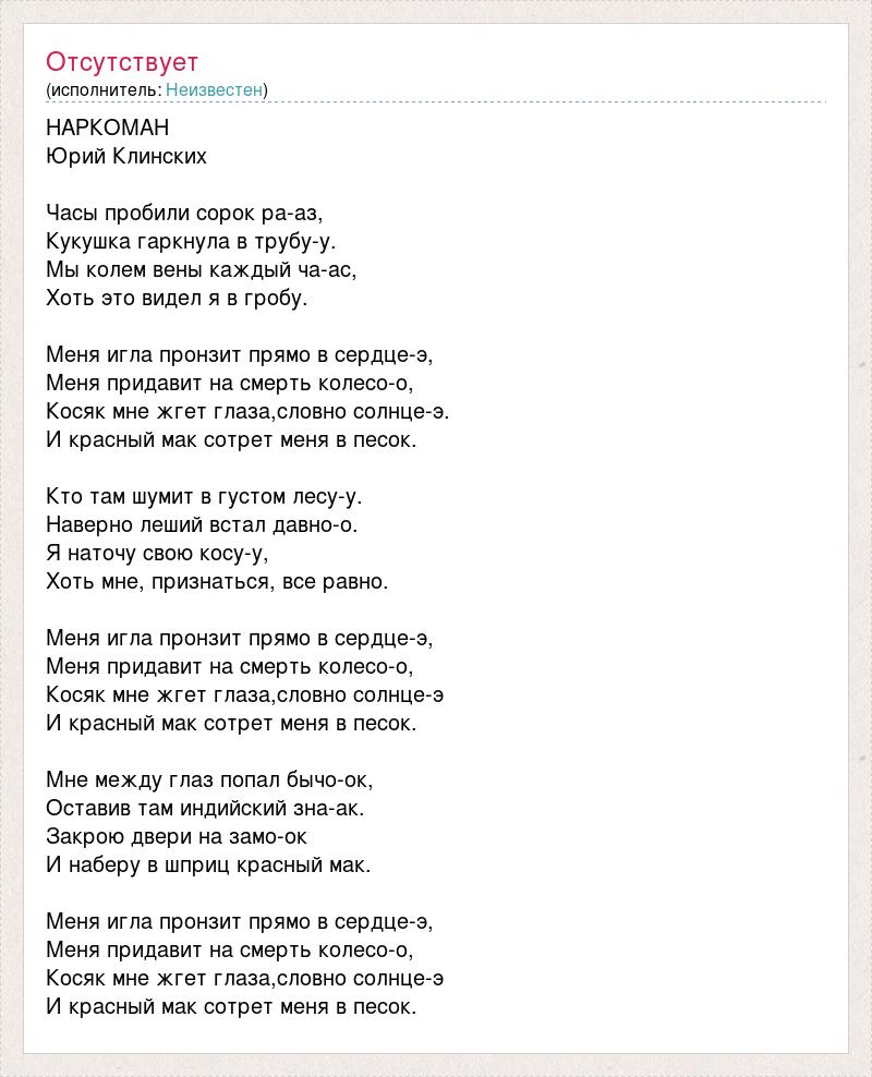 НАРКОМАН Юрий Клинских Часы пробили сорок ра-аз, Кукушка гаркнула в трубу-у. Мы колем вены каждый ча-ас, Хоть это видел я в гробу. Меня игла пронзит прямо в сердце-э, Меня придавит на смерть колесо-о, Косяк мне жгет глаза,словно солнце-э. И красный мак сотрет меня в песок. Кто там шумит в густом лесу-у. Наверно леший встал давно-о. Я наточу свою косу-у, Хоть мне, признаться, все равно. Меня игла пронзит прямо в сердце-э, Меня придавит на смерть колесо-о, Косяк мне жгет глаза,словно солнце-э И красный мак сотрет меня в песок. Мне между глаз попал бычо-ок, Оставив там индийский зна-ак. Закрою двери на замо-ок И наберу в шприц красный мак. Меня игла пронзит прямо в сердце-э, Меня придавит на смерть колесо-о, Косяк мне жгет глаза,словно солнце-э И красный мак сотрет меня в песок.