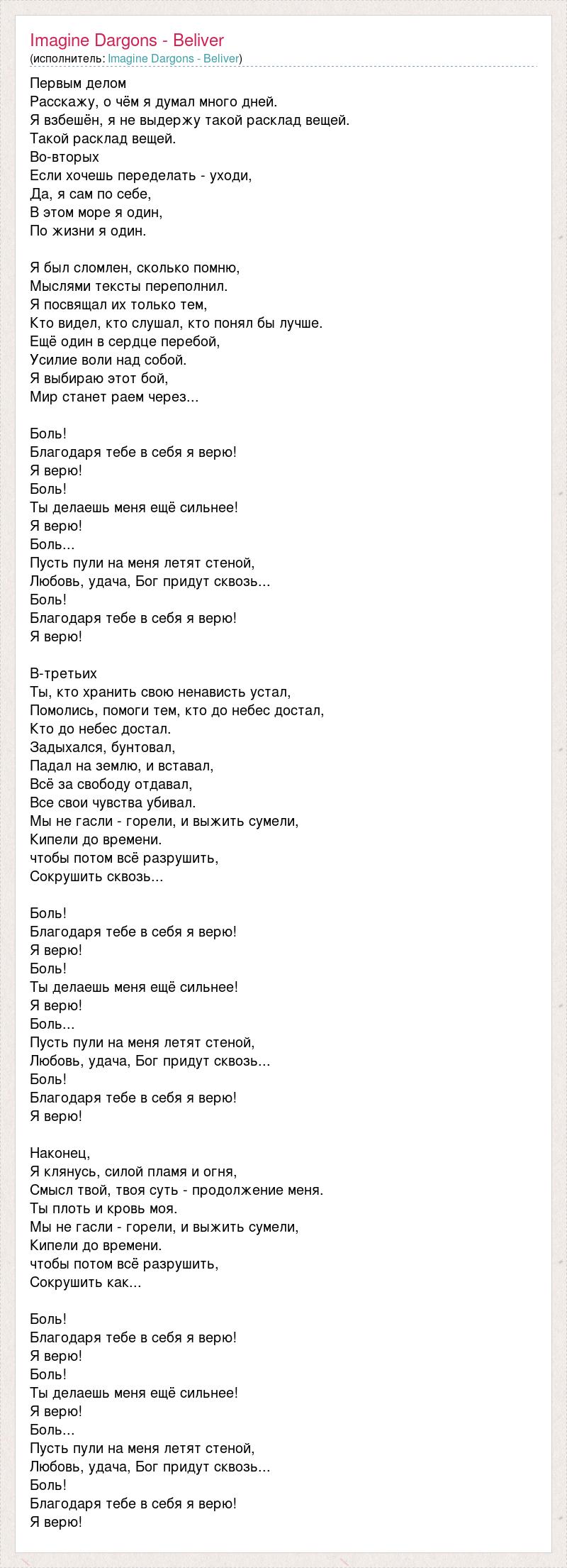 Первым делом Расскажу, о чём я думал много дней. Я взбешён, я не выдержу такой расклад вещей. Такой расклад вещей. Во-вторых Если хочешь переделать - уходи, Да, я сам по себе, В этом море я один, По жизни я один. Я был сломлен, сколько помню, Мыслями тексты переполнил. Я посвящал их только тем, Кто видел, кто слушал, кто понял бы лучше. Ещё один в сердце перебой, Усилие воли над собой. Я выбираю этот бой, Мир станет раем через... Боль! Благодаря тебе в себя я верю! Я верю! Боль! Ты делаешь меня ещё сильнее! Я верю! Боль... Пусть пули на меня летят стеной, Любовь, удача, Бог придут сквозь... Боль! Благодаря тебе в себя я верю! Я верю! В-третьих Ты, кто хранить свою ненависть устал, Помолись, помоги тем, кто до небес достал, Кто до небес достал. Задыхался, бунтовал, Падал на землю, и вставал, Всё за свободу отдавал, Все свои чувства убивал. Мы не гасли - горели, и выжить сумели, Кипели до времени. чтобы потом всё разрушить, Сокрушить сквозь... Боль! Благодаря тебе в себя я верю! Я верю! Боль! Ты делаешь меня ещё сильнее! Я верю! Боль... Пусть пули на меня летят стеной, Любовь, удача, Бог придут сквозь... Боль! Благодаря тебе в себя я верю! Я верю! Наконец, Я клянусь, силой пламя и огня, Смысл твой, твоя суть - продолжение меня. Ты плоть и кровь моя. Мы не гасли - горели, и выжить сумели, Кипели до времени. чтобы потом всё разрушить, Сокрушить как... Боль! Благодаря тебе в себя я верю! Я верю! Боль! Ты делаешь меня ещё сильнее! Я верю! Боль... Пусть пули на меня летят стеной, Любовь, удача, Бог придут сквозь... Боль! Благодаря тебе в себя я верю! Я верю!