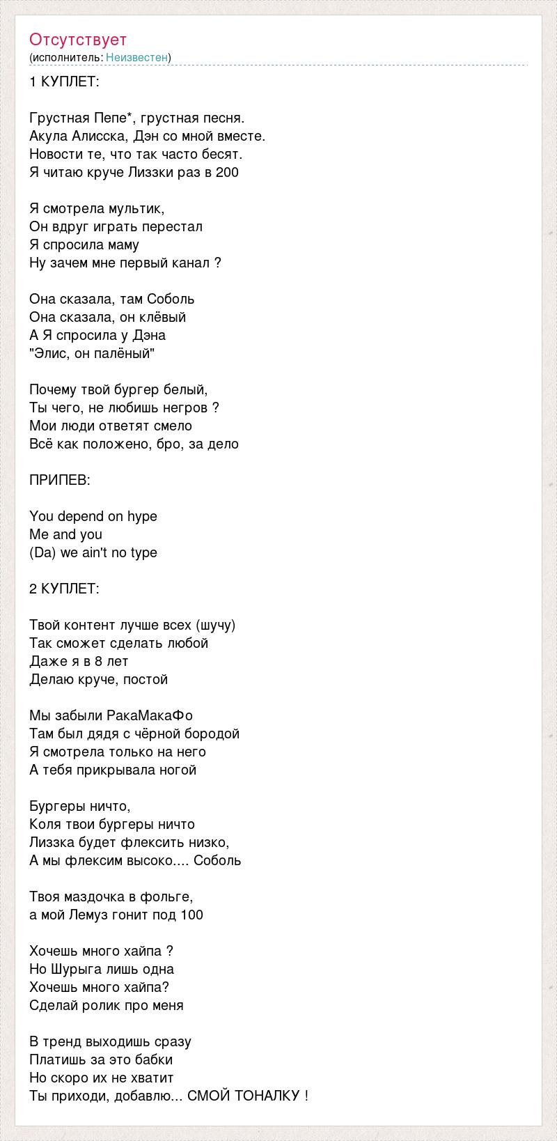 1 КУПЛЕТ: Грустная Пепе*, грустная песня. Акула Алисска, Дэн со мной вместе. Новости те, что так часто бесят. Я читаю круче Лиззки раз в 200 Я смотрела мультик, Он вдруг играть перестал Я спросила маму Ну зачем мне первый канал ? Она сказала, там Соболь Она сказала, он клёвый А Я спросила у Дэна "Элис, он палёный" Почему твой бургер белый, Ты чего, не любишь негров ? Мои люди ответят смело Всё как положено, бро, за дело ПРИПЕВ: You depend on hype Me and you (Da) we ain't no type 2 КУПЛЕТ: Твой контент лучше всех (шучу) Так сможет сделать любой Даже я в 8 лет Делаю круче, постой Мы забыли РакаМакаФо Там был дядя с чёрной бородой Я смотрела только на него А тебя прикрывала ногой Бургеры ничто, Коля твои бургеры ничто Лиззка будет флексить низко, А мы флексим высоко.... Соболь Твоя маздочка в фольге, а мой Лемуз гонит под 100 Хочешь много хайпа ? Но Шурыга лишь одна Хочешь много хайпа? Сделай ролик про меня В тренд выходишь сразу Платишь за это бабки Но скоро их не хватит Ты приходи, добавлю... СМОЙ ТОНАЛКУ !