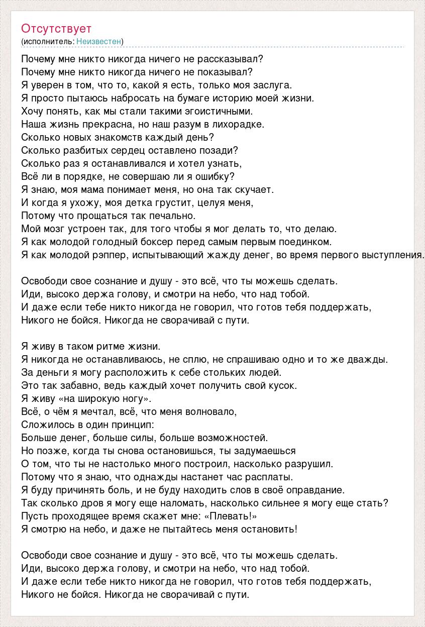 Почему мне никто никогда ничего не рассказывал? Почему мне никто никогда ничего не показывал? Я уверен в том, что то, какой я есть, только моя заслуга. Я просто пытаюсь набросать на бумаге историю моей жизни. Хочу понять, как мы стали такими эгоистичными. Наша жизнь прекрасна, но наш разум в лихорадке. Сколько новых знакомств каждый день? Сколько разбитых сердец оставлено позади? Сколько раз я останавливался и хотел узнать, Всё ли в порядке, не совершаю ли я ошибку? Я знаю, моя мама понимает меня, но она так скучает. И когда я ухожу, моя детка грустит, целуя меня, Потому что прощаться так печально. Мой мозг устроен так, для того чтобы я мог делать то, что делаю. Я как молодой голодный боксер перед самым первым поединком. Я как молодой рэппер, испытывающий жажду денег, во время первого выступления. Освободи свое сознание и душу - это всё, что ты можешь сделать. Иди, высоко держа голову, и смотри на небо, что над тобой. И даже если тебе никто никогда не говорил, что готов тебя поддержать, Никого не бойся. Никогда не сворачивай с пути. Я живу в таком ритме жизни. Я никогда не останавливаюсь, не сплю, не спрашиваю одно и то же дважды. За деньги я могу расположить к себе стольких людей. Это так забавно, ведь каждый хочет получить свой кусок. Я живу «на широкую ногу». Всё, о чём я мечтал, всё, что меня волновало, Сложилось в один принцип: Больше денег, больше силы, больше возможностей. Но позже, когда ты снова остановишься, ты задумаешься О том, что ты не настолько много построил, насколько разрушил. Потому что я знаю, что однажды настанет час расплаты. Я буду причинять боль, и не буду находить слов в своё оправдание. Так сколько дров я могу еще наломать, насколько сильнее я могу еще стать? Пусть проходящее время скажет мне: «Плевать!» Я смотрю на небо, и даже не пытайтесь меня остановить! Освободи свое сознание и душу - это всё, что ты можешь сделать. Иди, высоко держа голову, и смотри на небо, что над тобой. И даже если тебе никто никогда не говорил, что готов тебя поддержать, Никого не бойся. Никогда не сворачивай с пути.