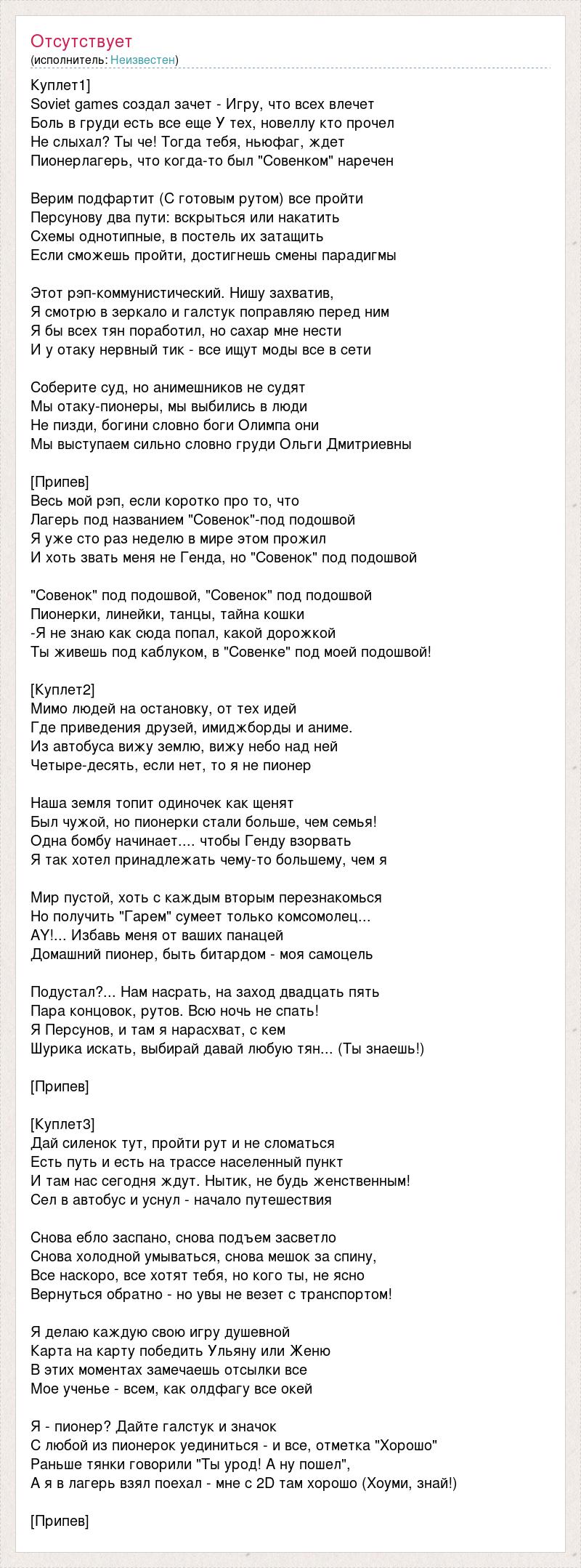 Куплет1] Soviet games создал зачет - Игру, что всех влечет Боль в груди есть все еще У тех, новеллу кто прочел Не слыхал? Ты че! Тогда тебя, ньюфаг, ждет Пионерлагерь, что когда-то был "Совенком" наречен Верим подфартит (С готовым рутом) все пройти Персунову два пути: вскрыться или накатить Схемы однотипные, в постель их затащить Если сможешь пройти, достигнешь смены парадигмы Этот рэп-коммунистический. Нишу захватив, Я смотрю в зеркало и галстук поправляю перед ним Я бы всех тян поработил, но сахар мне нести И у отаку нервный тик - все ищут моды все в сети Соберите суд, но анимешников не судят Мы отаку-пионеры, мы выбились в люди Не пизди, богини словно боги Олимпа они Мы выступаем сильно словно груди Ольги Дмитриевны [Припев] Весь мой рэп, если коротко про то, что Лагерь под названием "Совенок"-под подошвой Я уже сто раз неделю в мире этом прожил И хоть звать меня не Генда, но "Совенок" под подошвой "Совенок" под подошвой, "Совенок" под подошвой Пионерки, линейки, танцы, тайна кошки -Я не знаю как сюда попал, какой дорожкой Ты живешь под каблуком, в "Совенке" под моей подошвой! [Куплет2] Мимо людей на остановку, от тех идей Где приведения друзей, имиджборды и аниме. Из автобуса вижу землю, вижу небо над ней Четыре-десять, если нет, то я не пионер Наша земля топит одиночек как щенят Был чужой, но пионерки стали больше, чем семья! Одна бомбу начинает.... чтобы Генду взорвать Я так хотел принадлежать чему-то большему, чем я Мир пустой, хоть с каждым вторым перезнакомься Но получить "Гарем" сумеет только комсомолец... AY!... Избавь меня от ваших панацей Домашний пионер, быть битардом - моя самоцель Подустал?... Нам насрать, на заход двадцать пять Пара концовок, рутов. Всю ночь не спать! Я Персунов, и там я нарасхват, с кем Шурика искать, выбирай давай любую тян... (Ты знаешь!) [Припев] [Куплет3] Дай силенок тут, пройти рут и не сломаться Есть путь и есть на трассе населенный пункт И там нас сегодня ждут. Нытик, не будь женственным! Сел в автобус и уснул - начало путешествия Снова ебло заспано, снова подъем засветло Снова холодной умываться, снова мешок за спину, Все наскоро, все хотят тебя, но кого ты, не ясно Вернуться обратно - но увы не везет с транспортом! Я делаю каждую свою игру душевной Карта на карту победить Ульяну или Женю В этих моментах замечаешь отсылки все Мое ученье - всем, как олдфагу все окей Я - пионер? Дайте галстук и значок С любой из пионерок уединиться - и все, отметка "Хорошо" Раньше тянки говорили "Ты урод! А ну пошел", А я в лагерь взял поехал - мне с 2D там хорошо (Хоуми, знай!) [Припев]