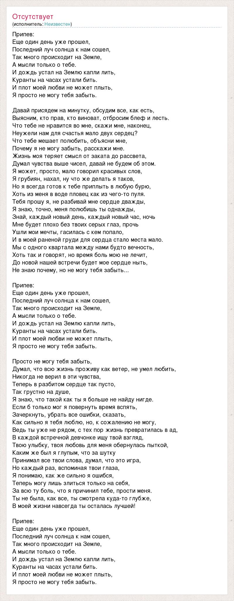 Припев: Еще один день уже прошел, Последний луч солнца к нам сошел, Так много происходит на Земле, А мысли только о тебе. И дождь устал на Землю капли лить, Куранты на часах устали бить. И плот моей любви не может плыть, Я просто не могу тебя забыть. Давай присядем на минутку, обсудим все, как есть, Выясним, кто прав, кто виноват, отбросим блеф и лесть. Что тебе не нравится во мне, скажи мне, наконец, Неужели нам для счастья мало двух сердец? Что тебе мешает полюбить, объясни мне, Почему я не могу забыть, расскажи мне. Жизнь моя теряет смысл от заката до рассвета, Думал чувства выше чисел, давай не будем об этом. Я может, просто, мало говорил красивых слов, Я грубиян, нахал, ну что же делать я таков, Но я всегда готов к тебе приплыть в любую бурю, Хоть из меня в воде пловец как из чего-то пуля. Тебя прошу я, не разбивай мне сердце дважды, Я знаю, точно, меня полюбишь ты однажды, Знай, каждый новый день, каждый новый час, ночь Мне будет плохо без твоих серых глаз, прочь Ушли мои мечты, гасилась с кем попало, И в моей раненой груди для сердца стало места мало. Мы с одного квартала между нами будто вечность, Хоть так и говорят, но время боль мою не лечит, До новой нашей встречи будет мое сердце ныть, Не знаю почему, но не могу тебя забыть... Припев: Еще один день уже прошел, Последний луч солнца к нам сошел, Так много происходит на Земле, А мысли только о тебе. И дождь устал на Землю капли лить, Куранты на часах устали бить. И плот моей любви не может плыть, Я просто не могу тебя забыть. Просто не могу тебя забыть, Думал, что всю жизнь проживу как ветер, не умел любить, Никогда не верил в эти чувства, Теперь в разбитом сердце так пусто, Так грустно на душе, Я знаю, что такой как ты я больше не найду нигде. Если б только мог я повернуть время вспять, Зачеркнуть, убрать все ошибки, сказать, Как сильно я тебя люблю, но, к сожалению не могу, Ведь ты уже не рядом, с тех пор жизнь превратилась в ад, В каждой встречной девчонке ищу твой взгляд, Твою улыбку, твоя любовь для меня обернулась пыткой, Каким же был я глупым, что за шутку Принимал все твои слова, думал, что это игра, Но каждый раз, вспоминая твои глаза, Я понимаю, как же сильно я ошибся, Теперь могу лишь злиться только на себя, За всю ту боль, что я причинил тебе, прости меня. Ты не была, как все, ты смотрела куда-то глубже, В моей жизни навсегда ты осталась лучшей! Припев: Еще один день уже прошел, Последний луч солнца к нам сошел, Так много происходит на Земле, А мысли только о тебе. И дождь устал на Землю капли лить, Куранты на часах устали бить. И плот моей любви не может плыть, Я просто не могу тебя забыть.